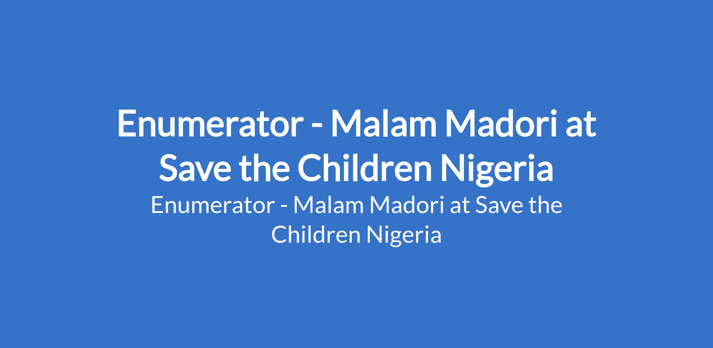 Save the Children Nigeria is recruiting to fill the position of: Enumerator. The position is located in Malam Madori, Jigawa State. The Enumerators will support community projects by collecting accurate and reliable data, engaging with community members, and contributing to efforts aimed at improving childrens learning outcomes and protection.