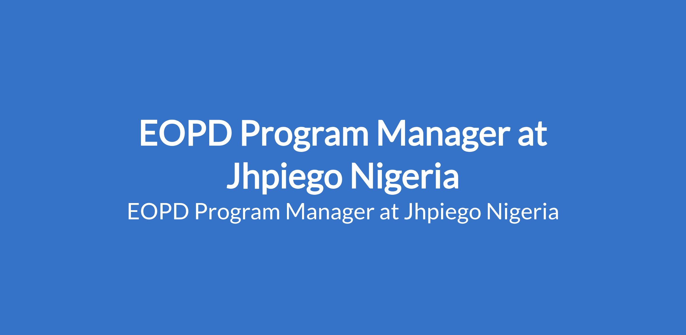 Jhpiego Nigeria is recruiting to fill the position of: EOPD Program Manager. The position is located in Abuja (FCT). Interested candidates should possess a Degree in Public Health, Project Management, Development Studies, or related field with 8 12 years of experience in program coordination, reporting, or project management within donor-funded health programs.