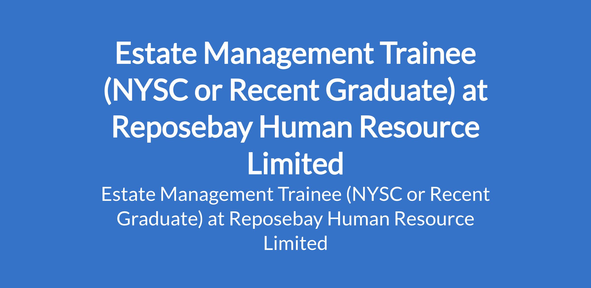 Reposebay Human Resource Limited is recruiting to fill the position of: Estate Management Trainee (NYSC or Recent Graduate). The position is located in Victoria Island, Lagos State. Interest candidates should possess a B.Sc / HND in Estate Management with 0 - 1 year work experience.