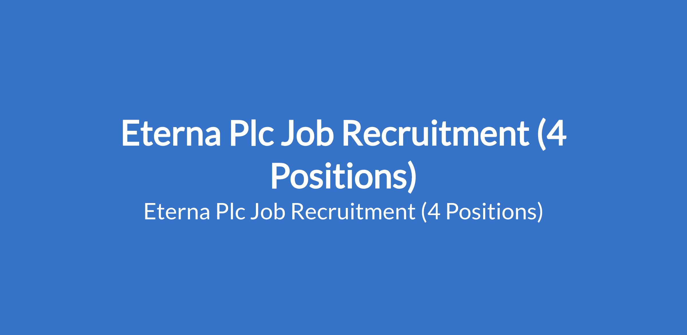 Eterna Plc is recruiting to fill the following positions in Anambra, Lagos and Ogun States: Lubricant Business Manager; Lubricant Area Sales Engineer; Lead, Enterprise Risk Management (ERM); and Depot Sales Officer.
