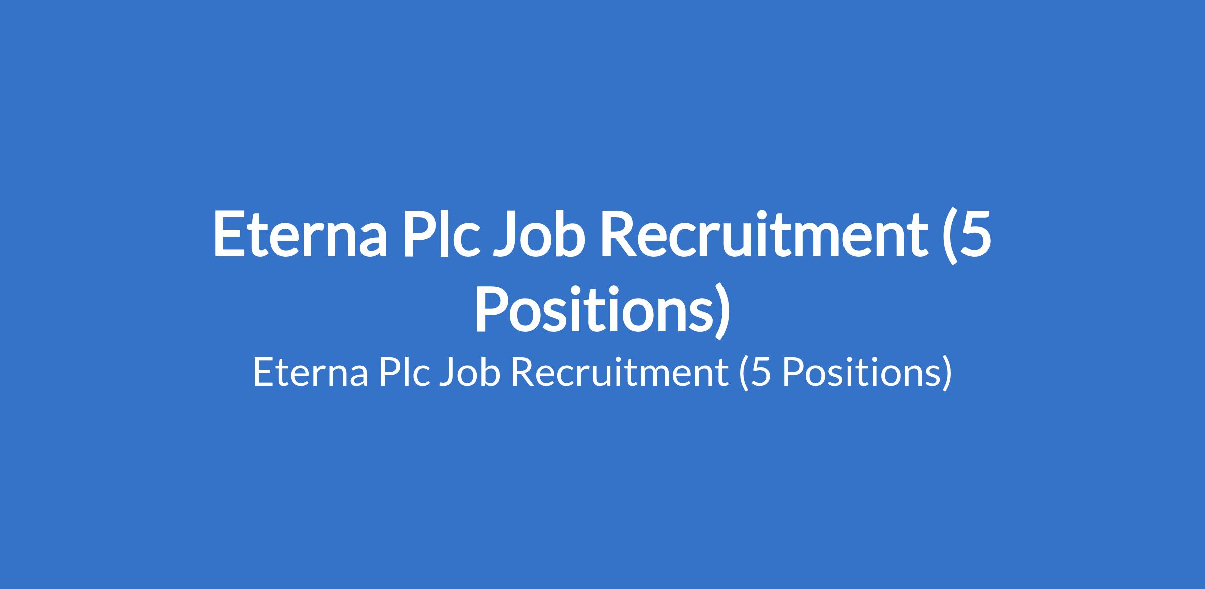 Eterna Plc is recruiting suitable candidates to fill the following positions in Rivers, Anambra, Enugu / Ebonyi, Ogun, Lagos, Ondo and Ekiti States: Area Sales Representative - Lubricant, Operations Manager, Technical Field Support - Lubricant, Senior Lubricant Business Manager, and Lubricant Business Lead.
