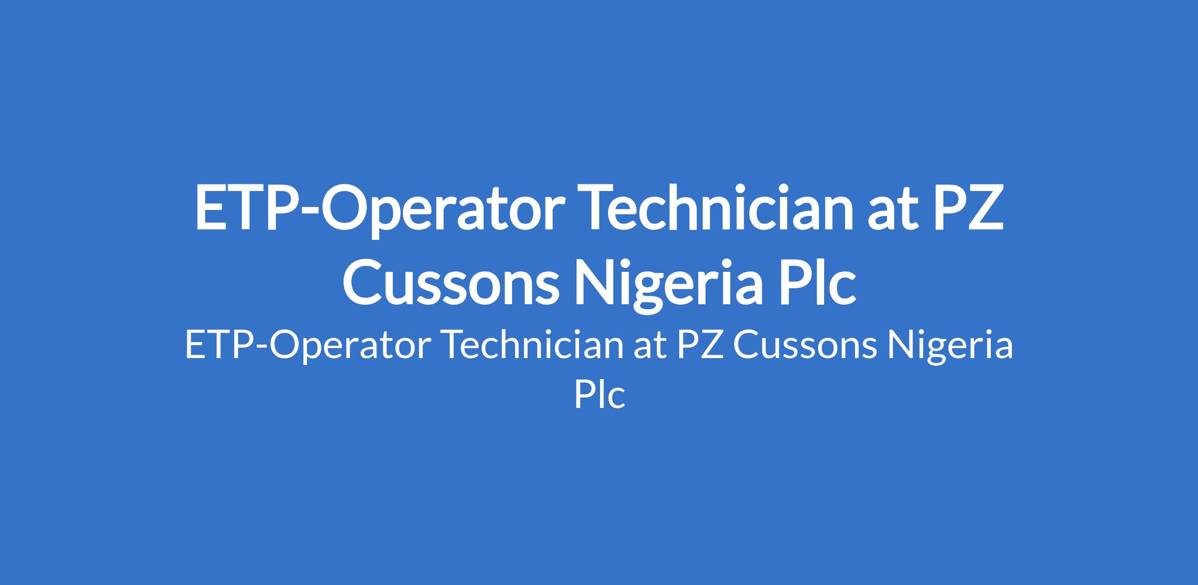 PZ Cussons Nigeria Plc is recruiting to fill the position of: ETP-Operator Technician. The position is located in Ikorodu, Lagos State. Interested candidates should possess an OND / HND / BSc Degree in Electrical / Mechanical Engineering & all Engineering related courses with 2 - 3 years ETP operation experience.
