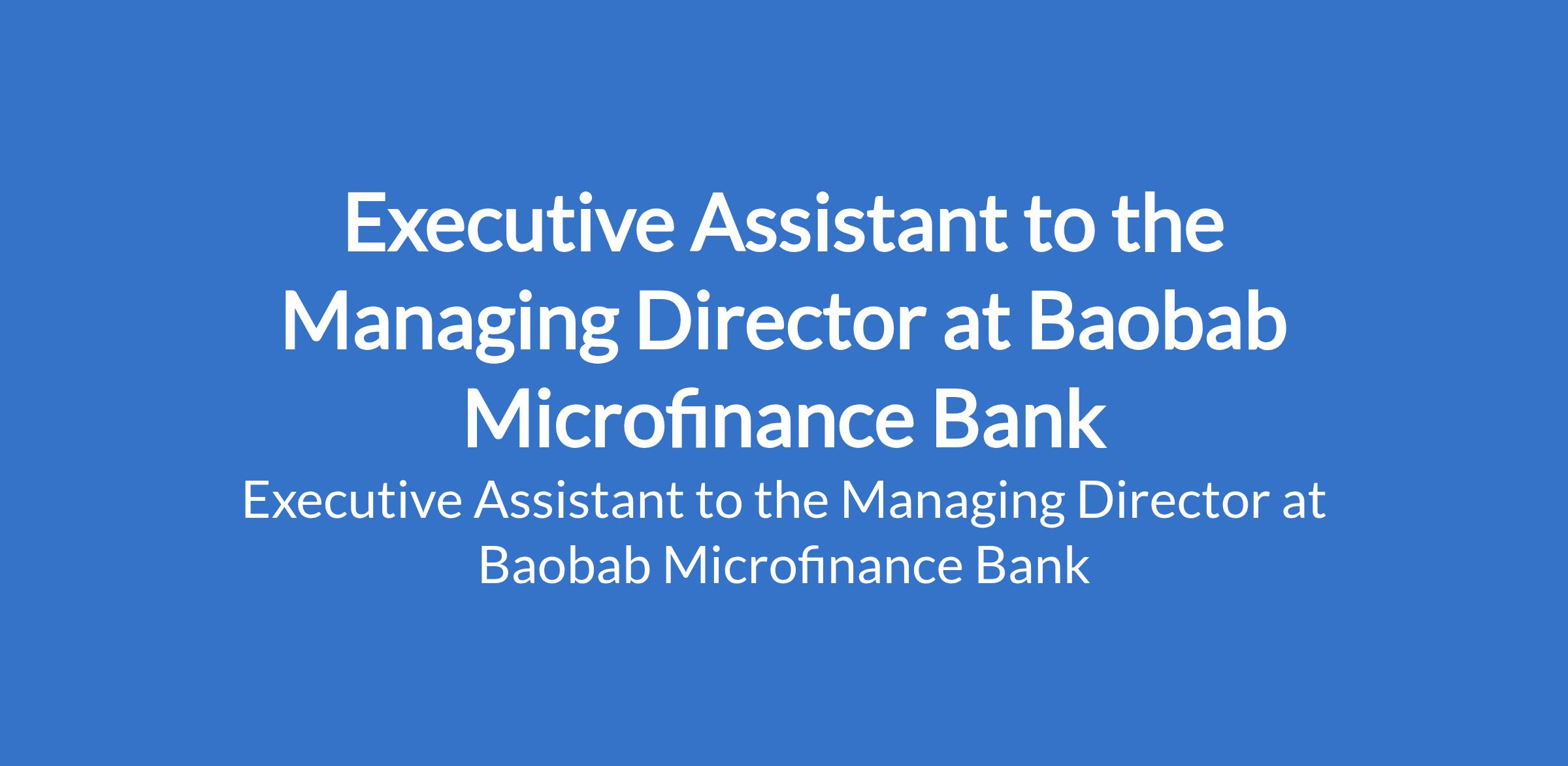 Baobab Microfinance Bank is recruiting to fill the position of: Executive Assistant to the Managing Director. The position is located in Lagos State. Interested candidates should possess a Bachelors Degree in Business Administration, Finance, Economics, or related fields with a minimum of 5 years post NYSC experience in a similar executive support role, preferably in banking or financial services.