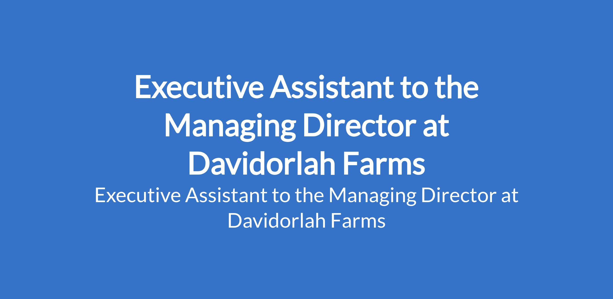 Davidorlah Farms is recruiting to fill the position of: Executive Assistant to the Managing Director. The position is located in Lekki, Lagos State. Interested candidates should possess minimum of BSc educational qualifications with 2 - 3 years experience, and must be living on the Island.