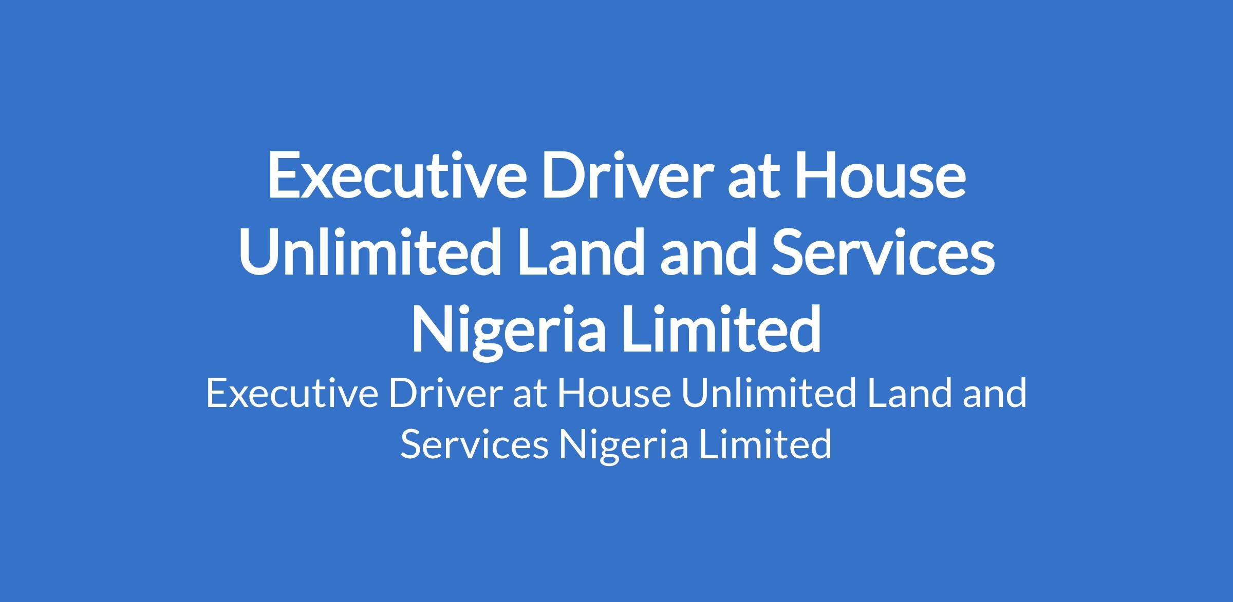 House Unlimited Land and Services Nigeria Limited is recruiting to fill the position of: Executive Driver. The position is located in Abuja (FCT). Salary: N80,000 (During Probation), N100,000 (Post-Probation). Interested candidates should possess a Valid drivers license with Good knowledge of Abuja roads and traffic patterns; a minimum of an SSCE (OND / NCE is an added advantage).