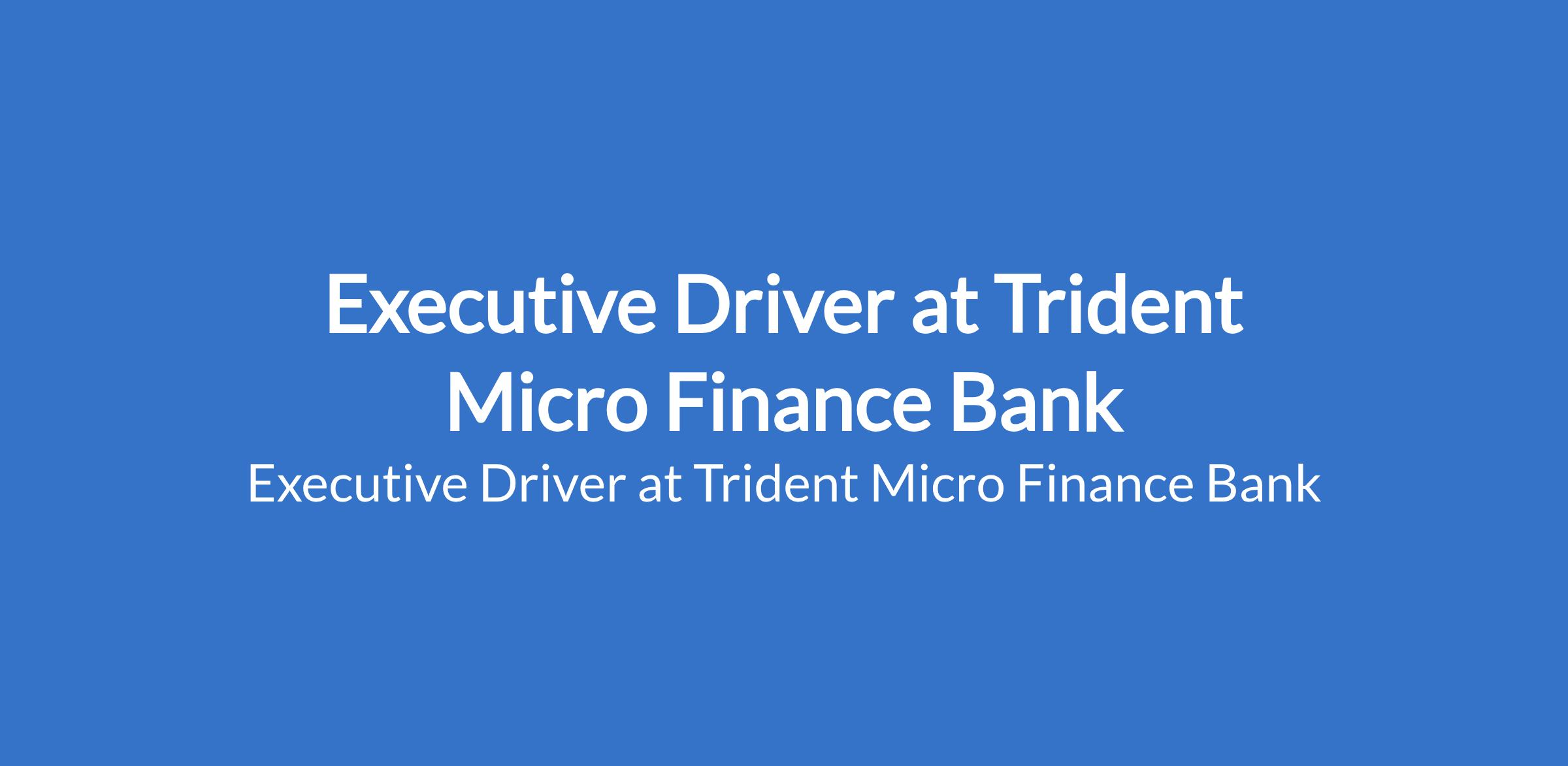 Trident Micro Finance Bank is recruiting to fill the position of: Executive Driver. The position is located in Gwarinpa Central Business District - Abuja (FCT). Interested candidates should possess minimum of an SSCE or equivalent and a valid, unexpired driver's license (mandatory) with 3-5 years experience as a professional or executive driver, and must reside within or very close to Gwarinpa axis (non-negotiable).