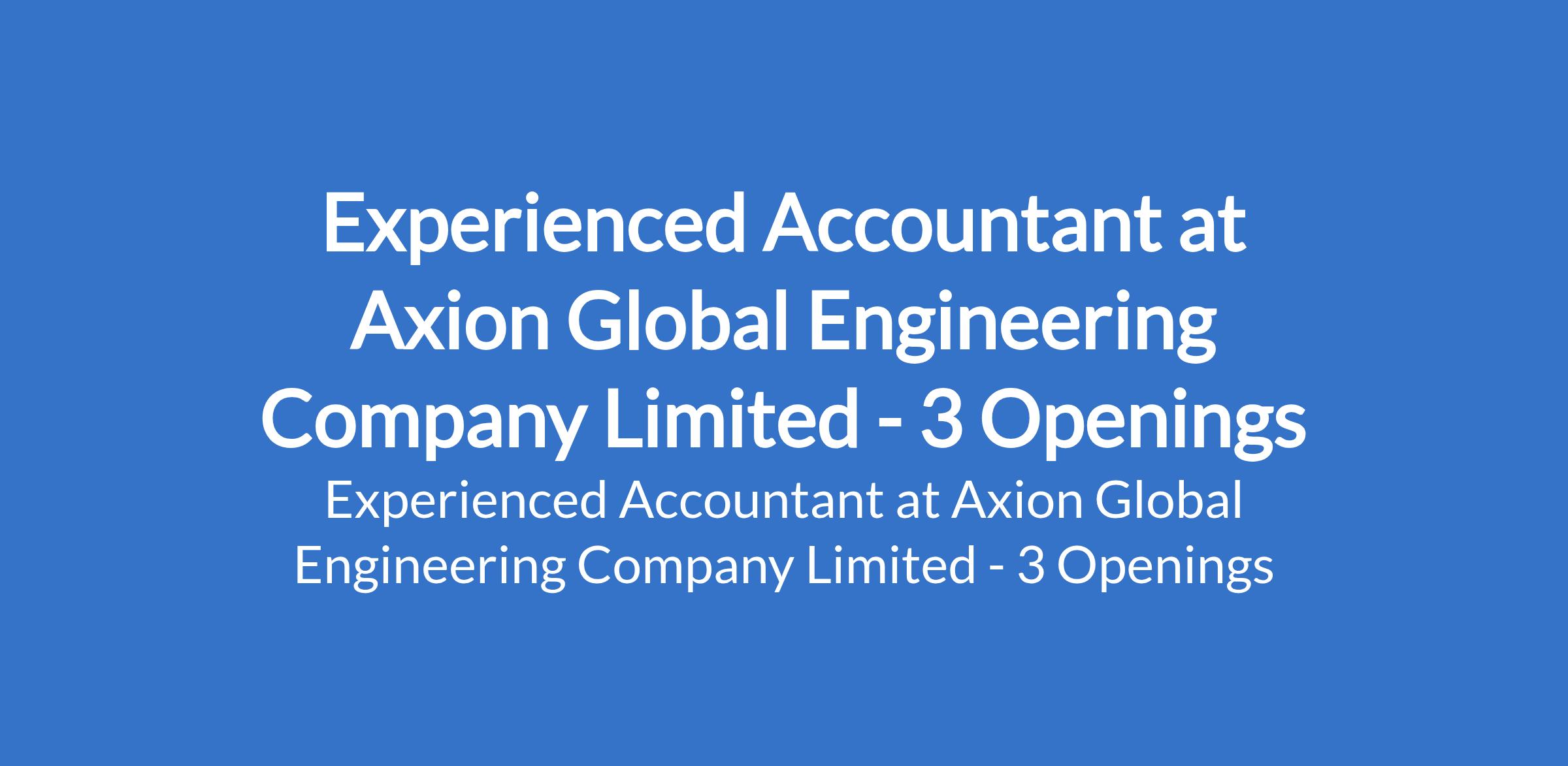 Axion Global Engineering Company Limited is recruiting to fill the position of: Experienced Accountant. The position is located in Abuja (FCT), Lagos, and Port Harcourt - Rivers States. Interested candidates should possess a Bachelors Degree in Accounting, Finance, or related field; professional certification is an advantage (ICAN, ACCA preferred), with 47 years of proven Accounting experience (mandatory); experience in construction, engineering, manufacturing, or project-based environment is highly required.