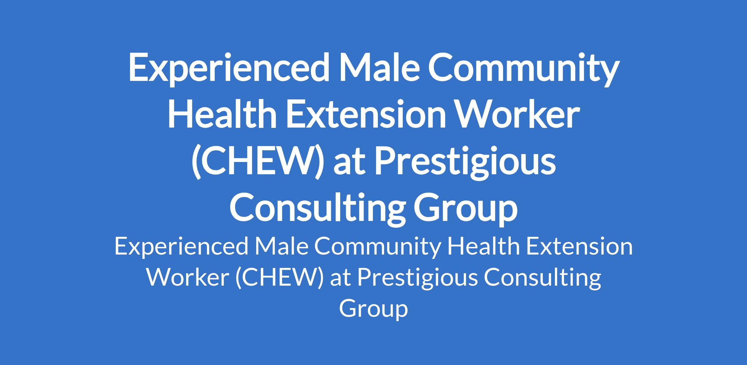 Prestigious Consulting Group is recruiting to fill the position of: Experienced Male Community Health Extension Worker (CHEW). The position is located in Agungi Lekki, Lagos State. Salary: N200,000 per month. Interested candidates should possess a Valid CHEW certification from a recognized institution with a minimum of 2 years relevant work experience in a healthcare facility.