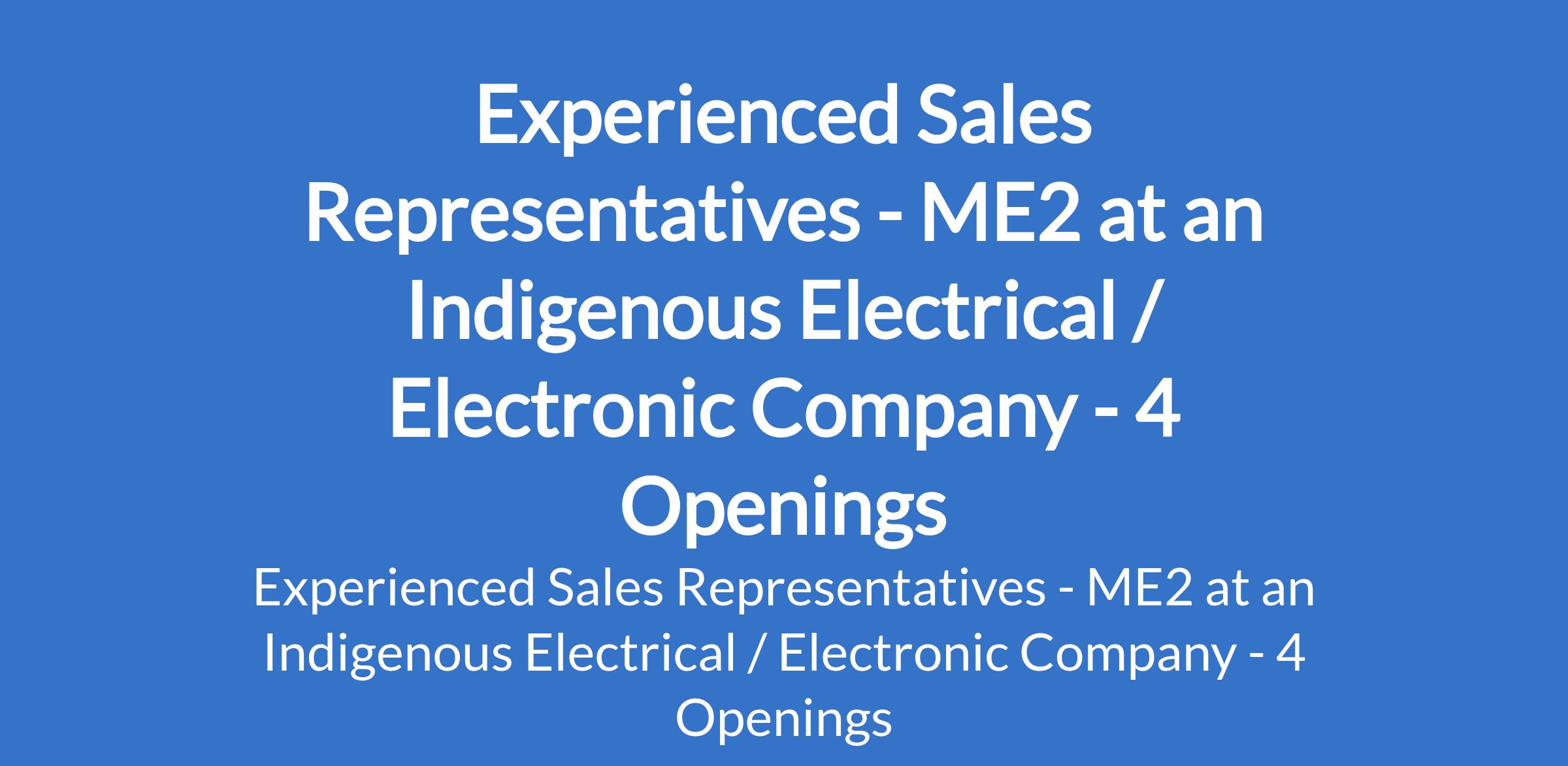 An Indigenous Electrical / Electronic Company is recruiting to fill the position of: Experienced Sales Representative - ME2. The position is located in Abuja, Lagos, Owerri - Imo, and Kano States. Interested candidates should be computer literate and a graduate of a reputable University with a Degree, and the ability to drive is an added advantage.