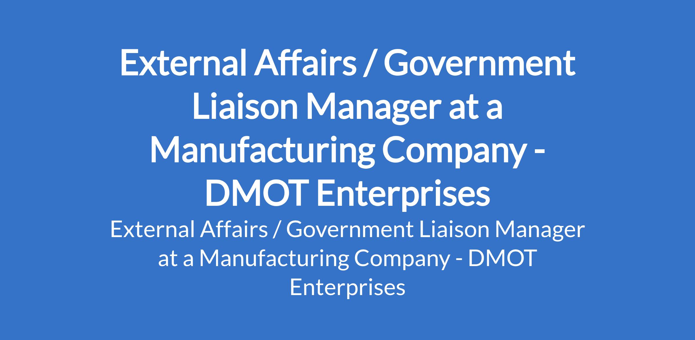 DMOT Enterprises - Our client, a Manufacturing company, is recruiting to fill the position of: External Affairs / Government Liaison Manager. The position is located in Lagos State. Interested candidates should possess a Degree in Social Sciences or Arts or related field with 6 to 10 years experience in external affairs / government relations, preferably in the Manufacturing company.