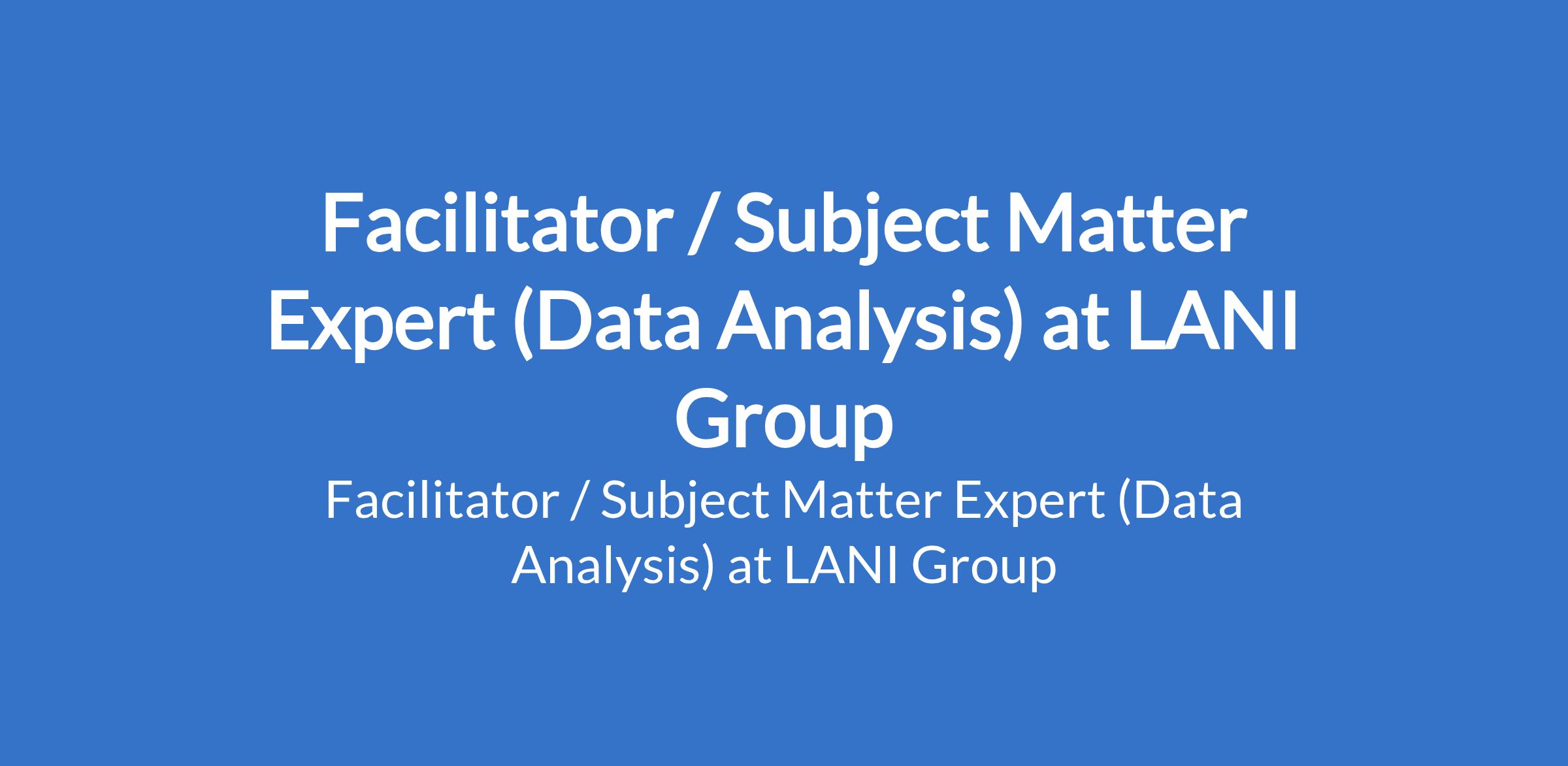 LANI Group is recruiting to fill the position of: Facilitator / Subject Matter Expert (Data Analysis). Interested candidates should possess relevant professional certificates.