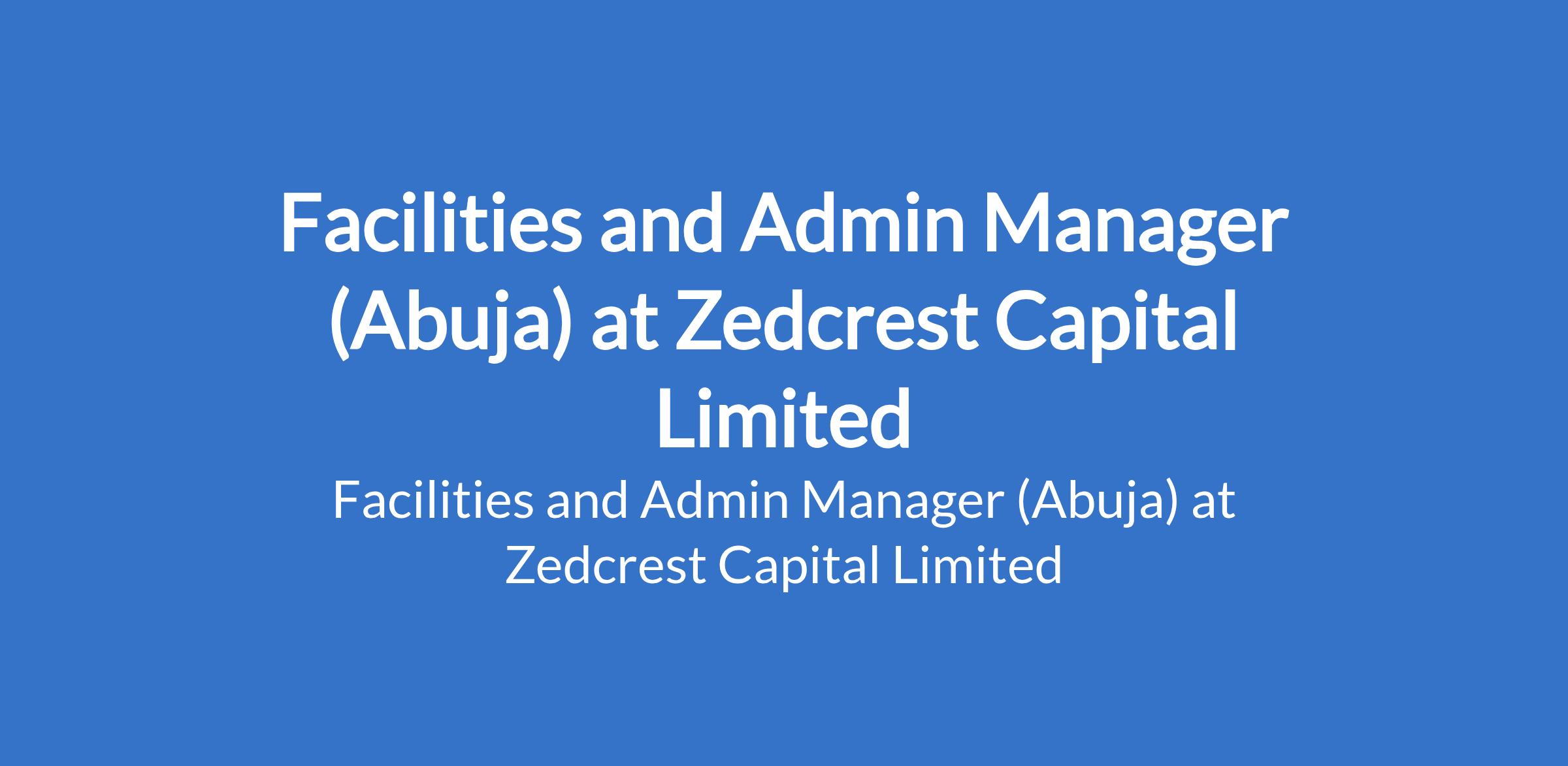 Zedcrest Capital Limited is recruiting to fill the position of: Facilities and Admin Manager. The position is located in Abuja. Interested candidates should possess a Bachelors Degree in Facilities Management, Estate Management, Engineering, Business Administration, or a related field with a minimum of 6 years experience in facilities, administration, or office operations, including hands-on experience managing office setups or fit-outs.