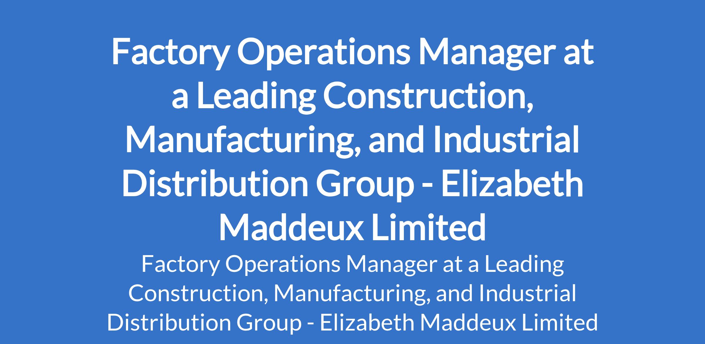 Elizabeth Maddeux Limited - Our client, a leading Construction, Manufacturing, and Industrial Distribution group is recruiting to fill the position of: Factory Operations Manager. The position is located in Sagamu, Ogun State. Salary: N800,000 - N1,000,000 monthly. Interested candidates should possess a Bachelors degree in Chemical Engineering, Mechanical Engineering, Industrial Engineering, or related discipline with 8 10 years of progressive experience in chemical or process manufacturing environments.