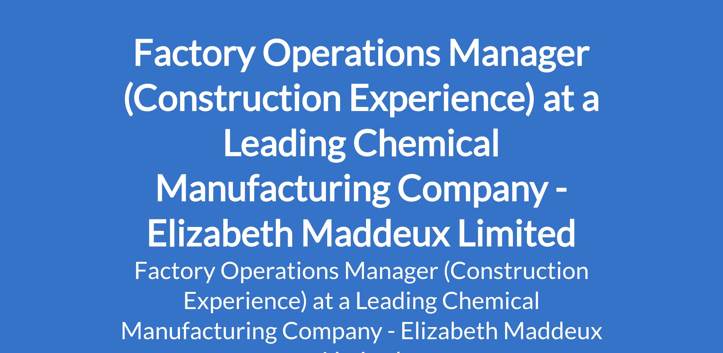Elizabeth Maddeux - Our client, a leading chemical manufacturing company, is recruiting to fill the position of: Factory Operations Manager (Construction Experience). The position is located in Sagamu, Ogun State. Salary: N800,000 - N1,000,000 monthly. Interested candidates should possess a Bachelors Degree in Chemical Engineering, Mechanical Engineering, Industrial Engineering, or related disciplines with 810 years of progressive experience in chemical or construction manufacturing environments and at least 5 years in a senior plant/operations leadership role.
