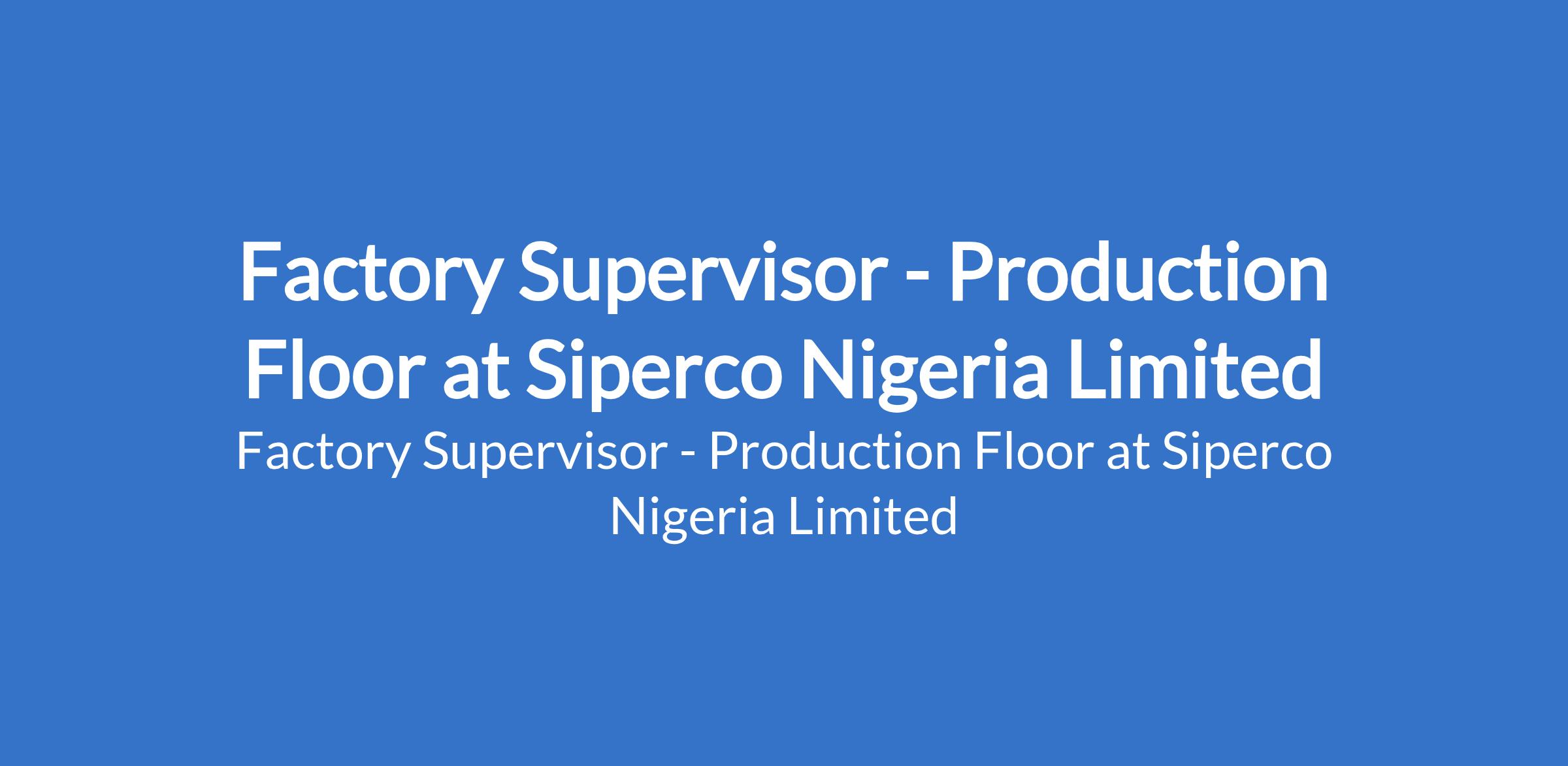 Siperco Nigeria Limited is recruiting to fill the position of: Factory Supervisor - Production Floor. The position is located in Mainland, Lagos State. Interested candidates should possess an OND, HND, or B.Sc in any relevant discipline with 48 years of experience in a manufacturing environment (prior experience as a factory supervisor in a plastic manufacturing company is highly required) and must be between 28-40 years.