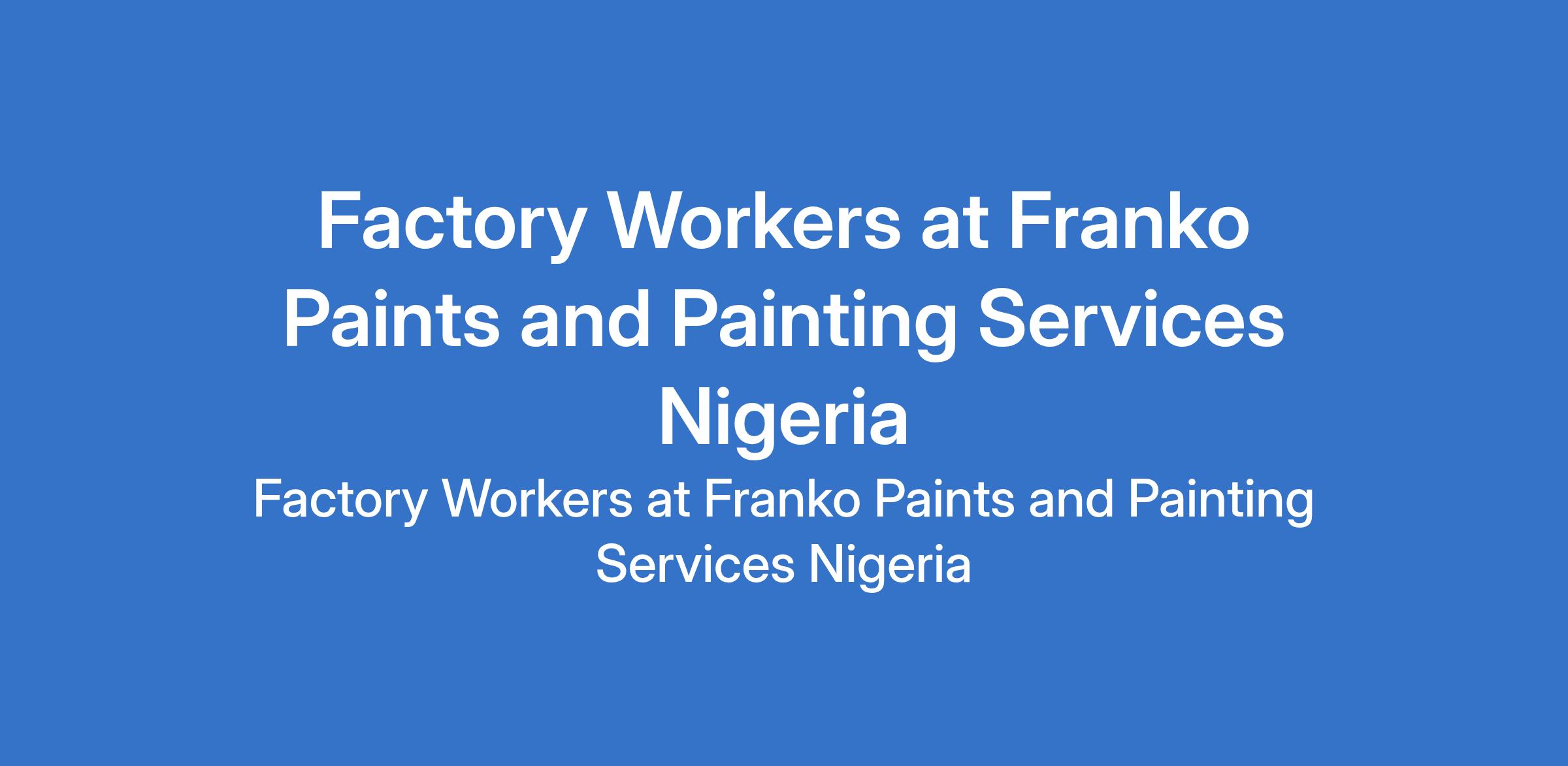 Franko Paints and Painting Services Nigeria is recruiting to fill the position of: Factory Worker. The position is located in Orlu / Umuaka, Imo State. Salary: N50,000 - N70,000 / month. Interested candidates should possess an HND / NCE / OND / SSCE with at least 2 years experience.
