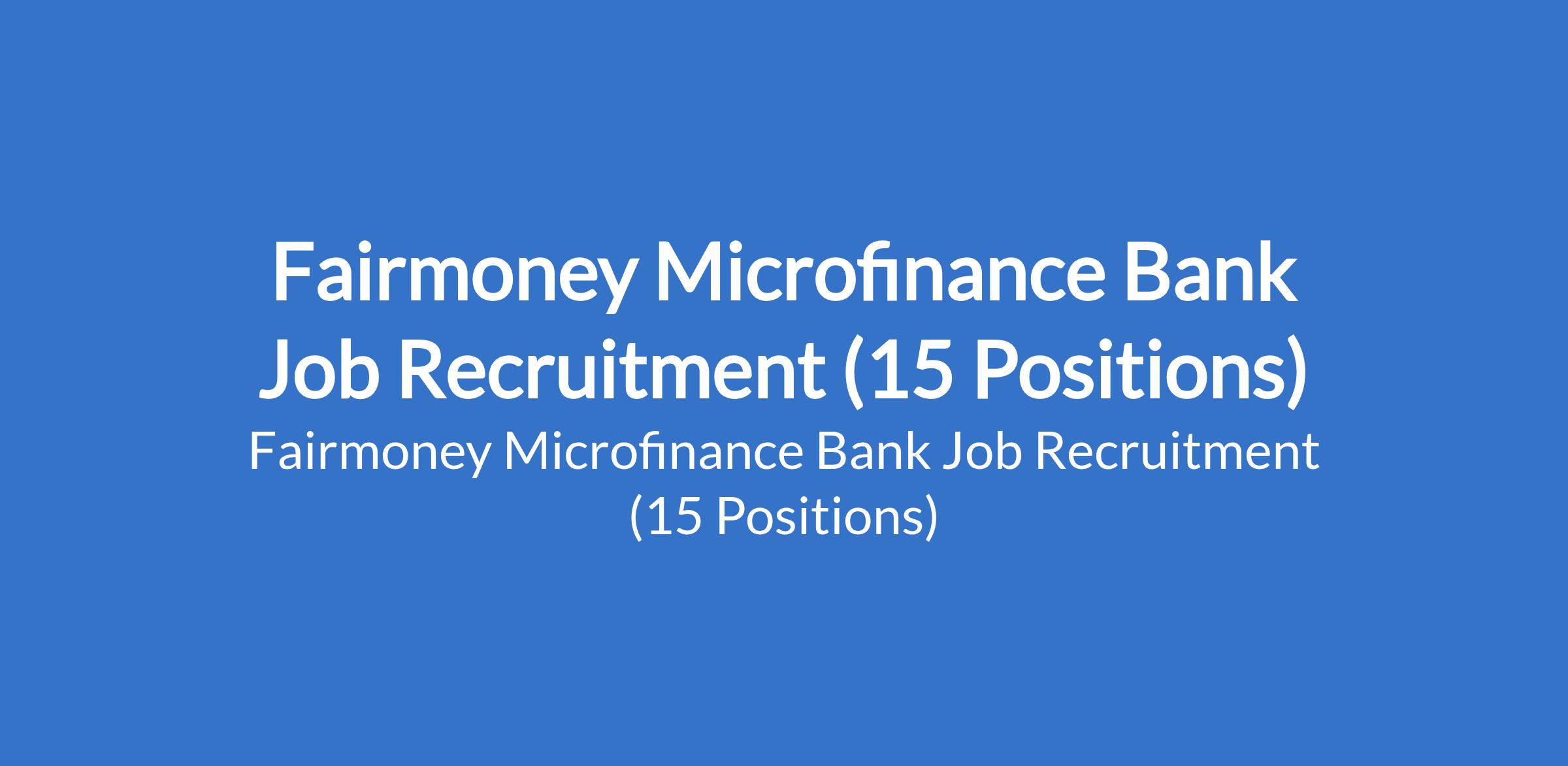 Fairmoney Microfinance Bank is recruiting suitable candidates to fill the following positions in Abuja (FCT), Nasarawa, Kano, Lagos, Imo, Oyo and Zamfara States: Senior Technical Product Manager; Team Manager - Merchant Lending; Field Verification / Recovery Officer; Sales Director - Business Banking; State Head - Aggregator Network, and Relationship Manager - Business Banking.
