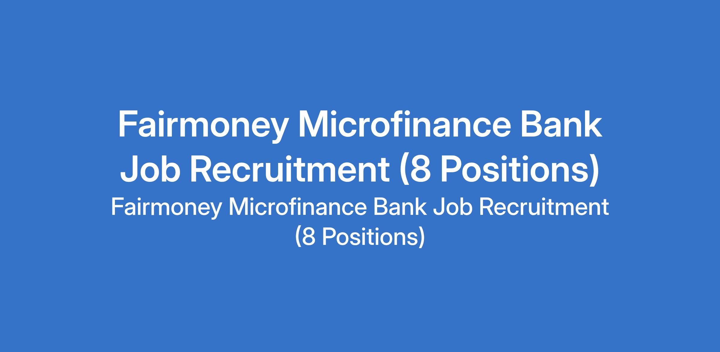 Fairmoney Microfinance Bank is recruiting suitable candidates to fill the following positions in Abuja, Enugu and Lagos States: Team Manager - Merchant Lending, Investment Analyst, Process / Program Manager (Procurement & Cost Optimization), Relationship Manager, Portfolio Manager, Growth Marketing Engineer, Product Designer, and Head of KYC and Onboarding.