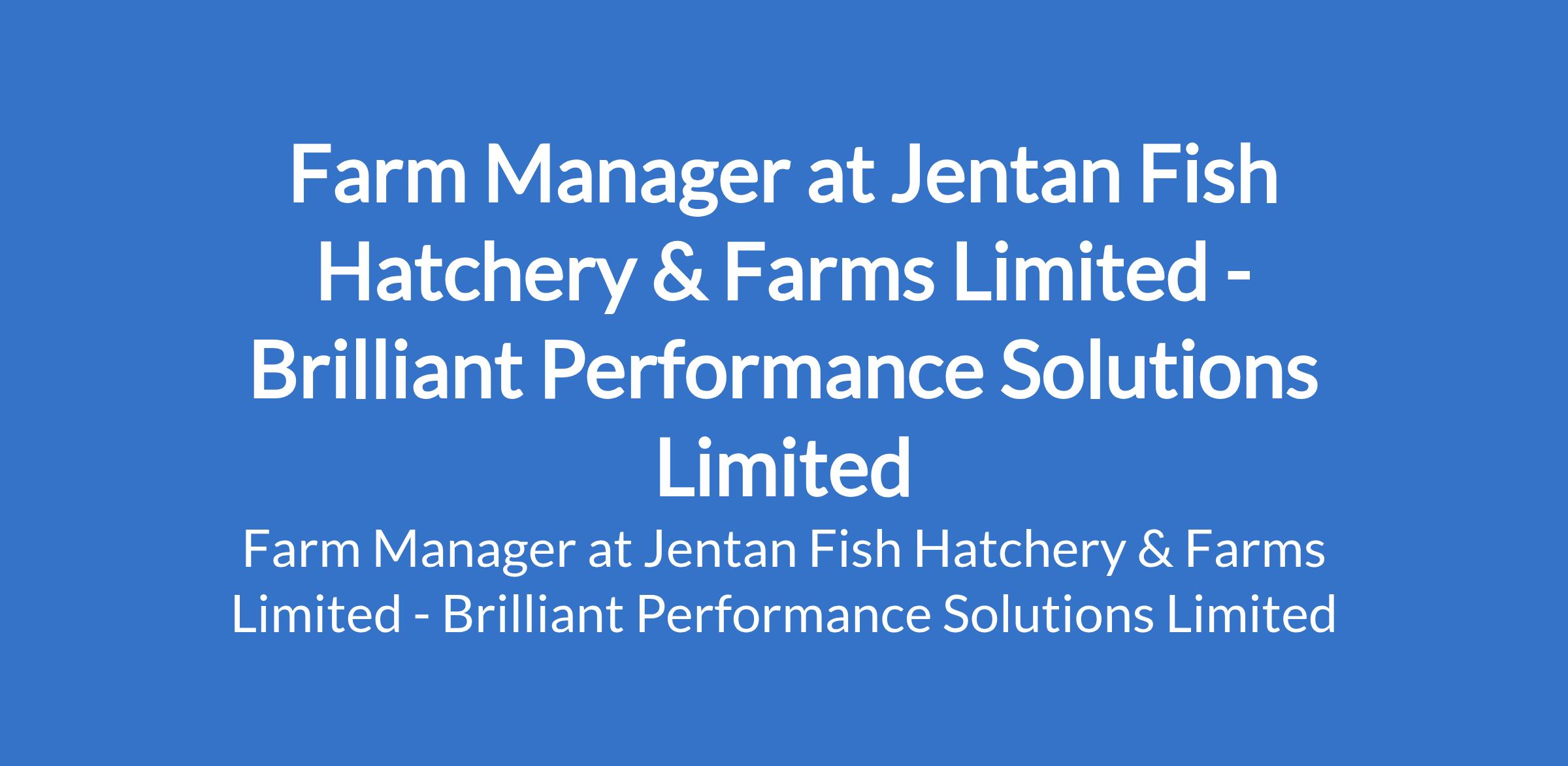 Brilliant Performance Solutions Limited - Our client, Jentan Fish Hatchery & Farms Limited is recruiting to fill the position of: Farm Manager. The position is located in Ozubulu, Ekwusigo LGA - Anambra State. Interested candidates should possess a Degree or Diploma in Aquaculture, Fisheries or related fields with 35 years of commercial fish farm management experience.