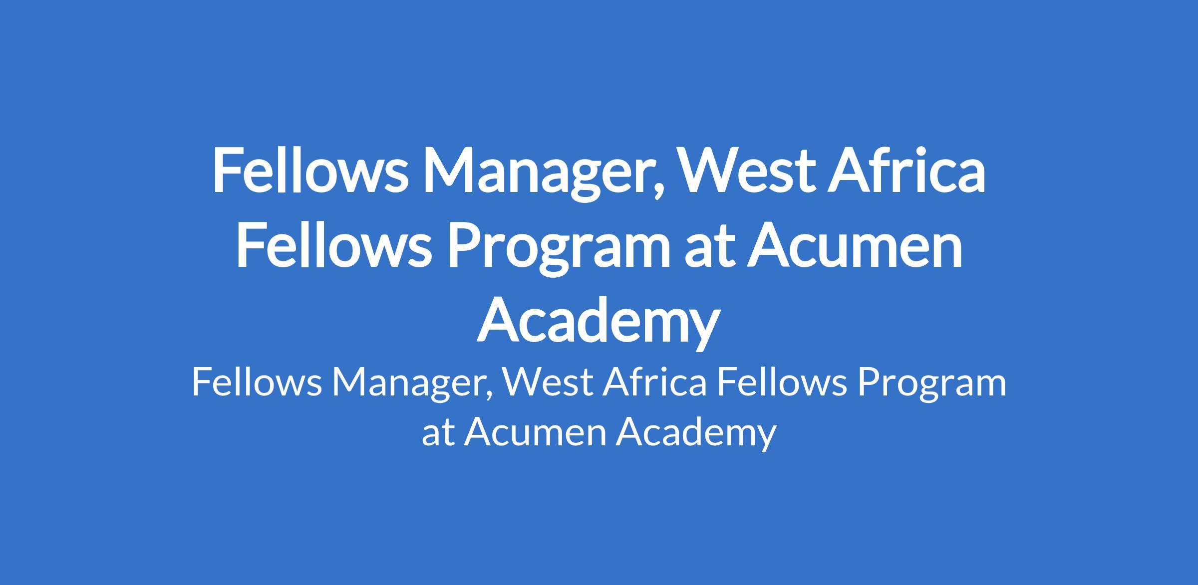 Acumen Academy is recruiting to fill the position of: Fellows Manager, West Africa Fellows Program. Interested candidates should possess relevant qualifications with a minimum of 7 years of experience in program leadership and management, preferably in leadership development, climate, entrepreneurship, or social impact