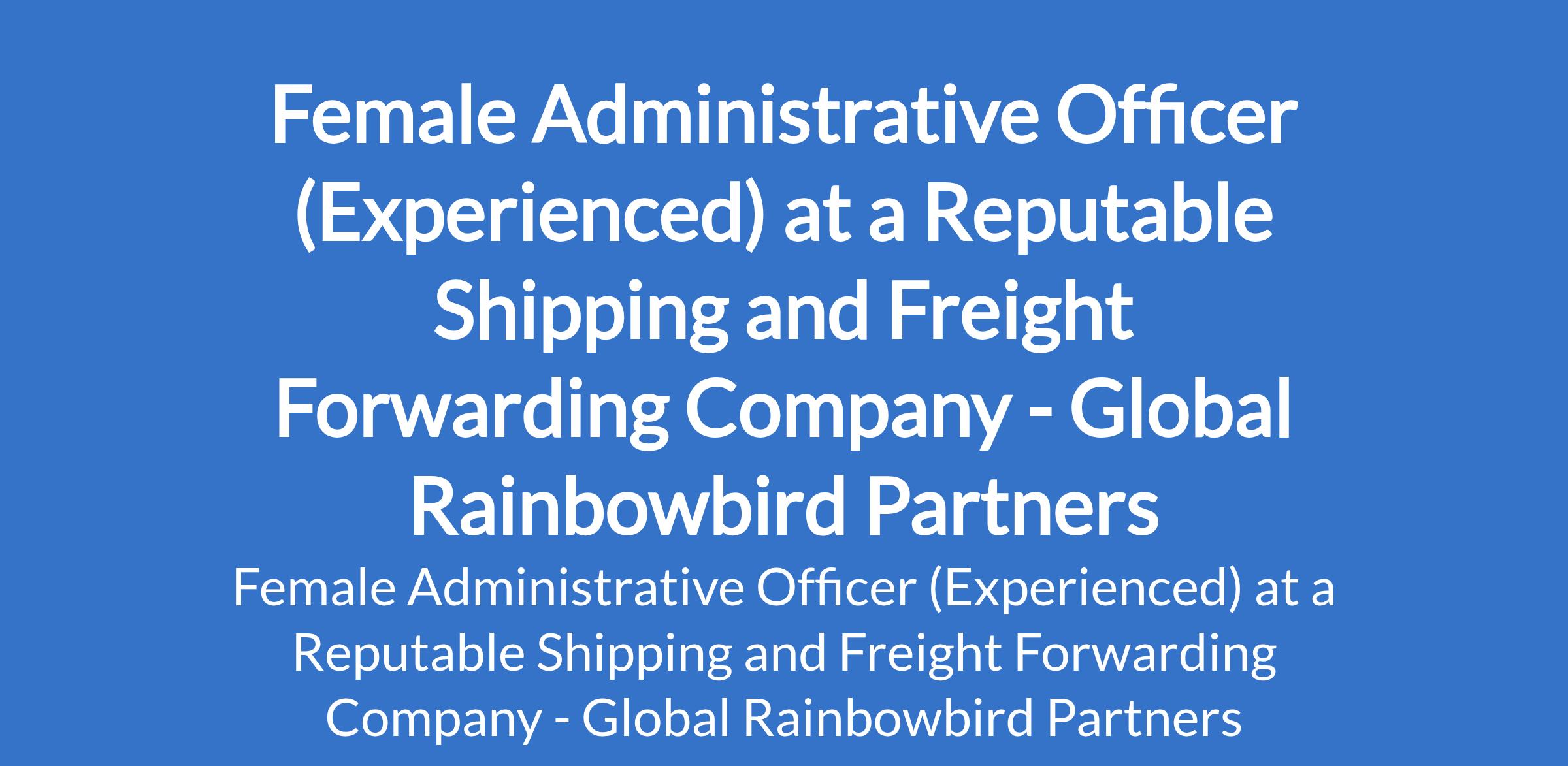 Global Rainbowbird Partners - Our client, a reputable shipping and freight forwarding company is recruiting to fill the position of: Female Administrative Officer (Experienced). The position is located in Olodi-Apapa, Lagos State. Salary: N150,000 - N250,000 monthly. Interested candidates should possess a minimum of B.Sc Degree qualification with 3-5 years experience.