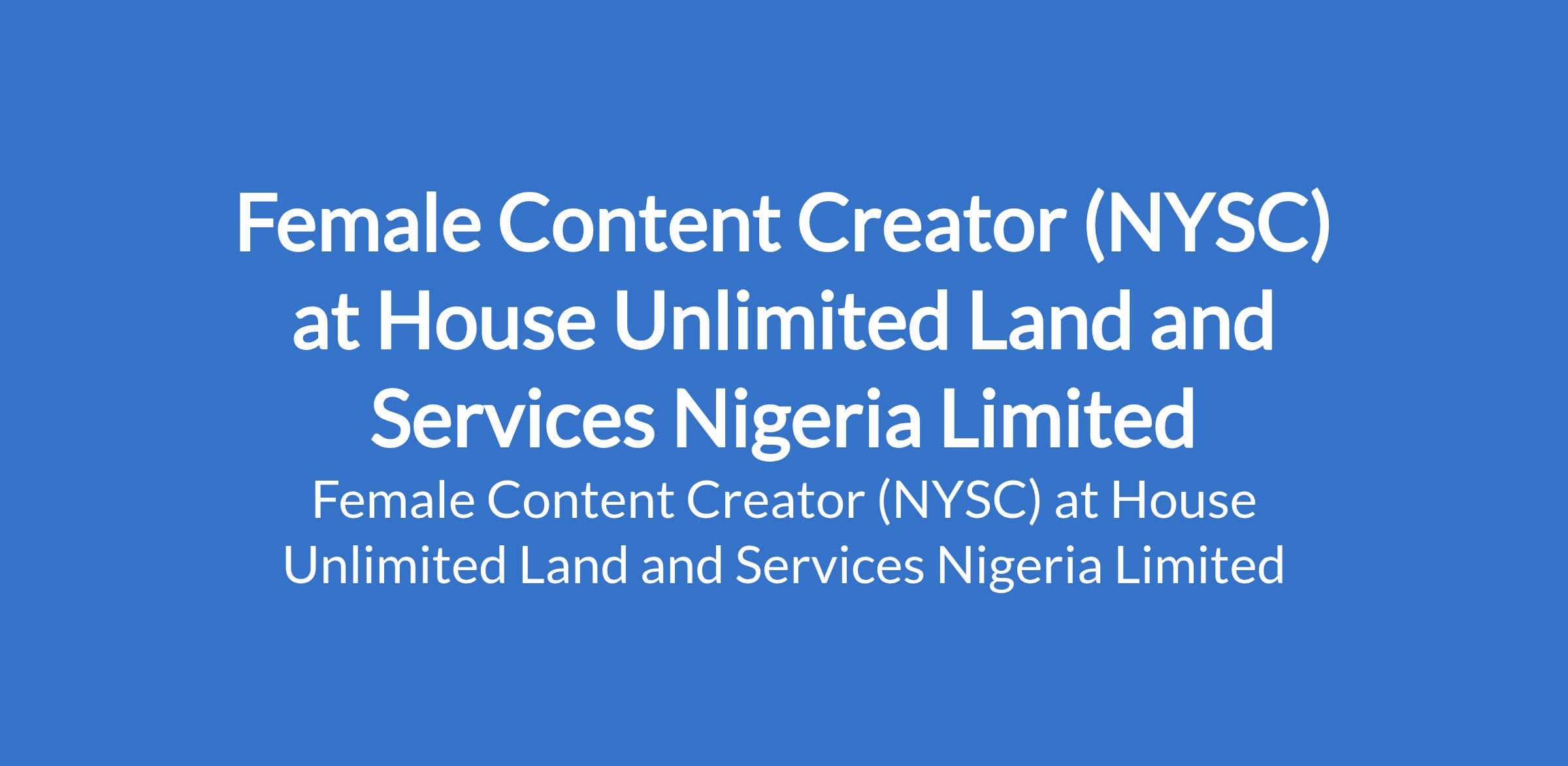 House Unlimited Land and Services Nigeria Limited is recruiting to fill the position of: Female Content Creator (NYSC). The position is located in Abuja (FCT). Monthly allowance: N50,000. Interested candidates should have a passion for TikTok and digital content creation; NYSC members seeking PPA placement are strongly encouraged to apply.