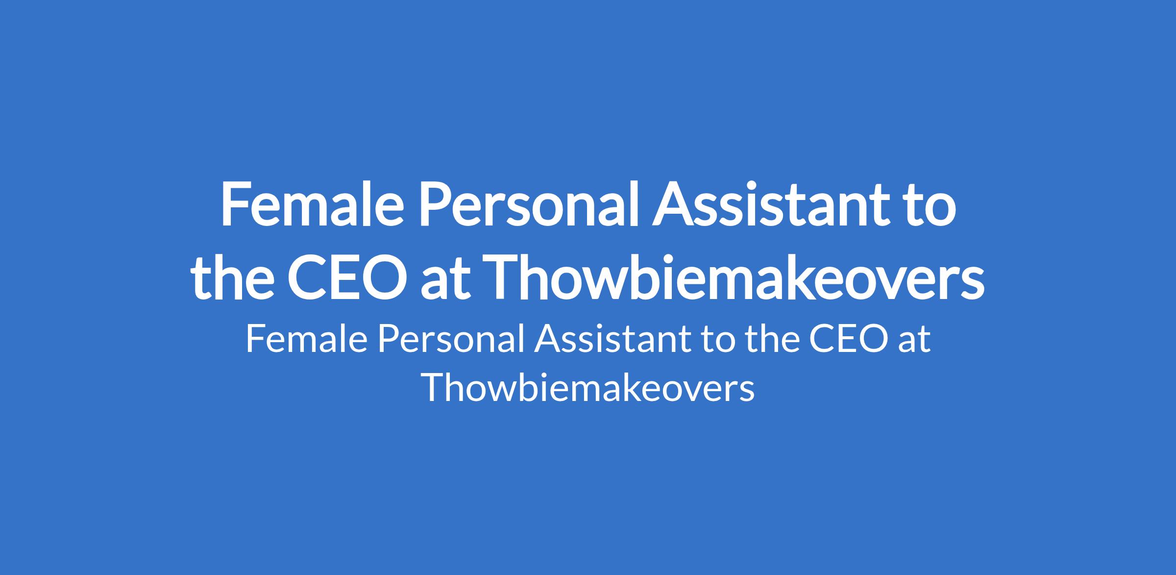 Thowbiemakeovers is recruiting to fill the position of: Female Personal Assistant to the CEO. The position is located in Ojodu Berger & Environs, Lagos State. Salary: N150,000 - N200,000 / month. Interested candidates should possess a minimum of B.Sc or equivalent qualification with at least 2 years experience as a Personal Assistant or similar role and must not be less than 21 years not more than 30 years.