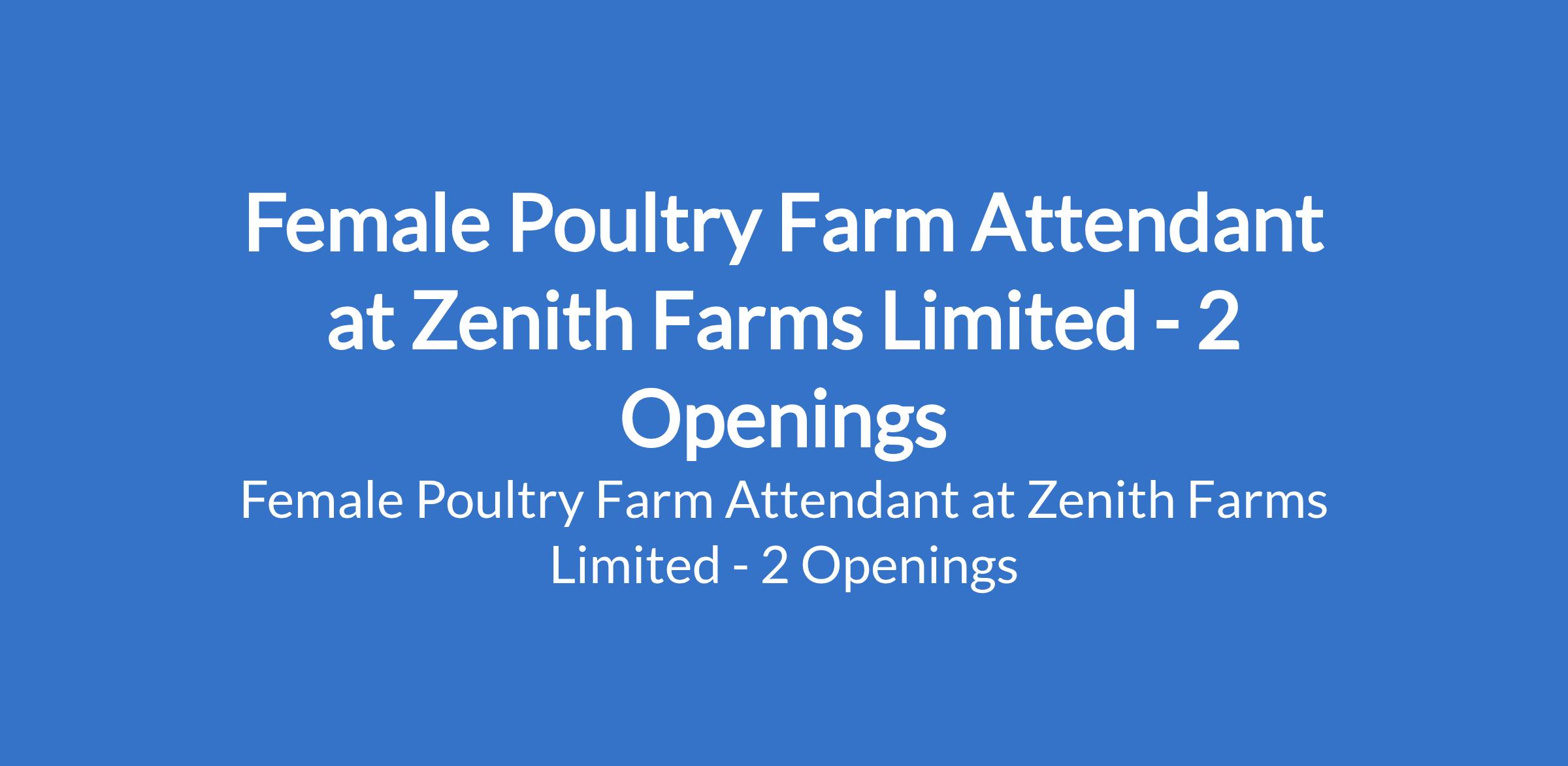 Zenith Farms Limited is recruiting to fill the position of: Female Poultry Farm Attendant. The position is located in Ibadan, Oyo State. Salary: N450,000 - N500,000 monthly. Interested candidates should possess relevant qualifications with experience.