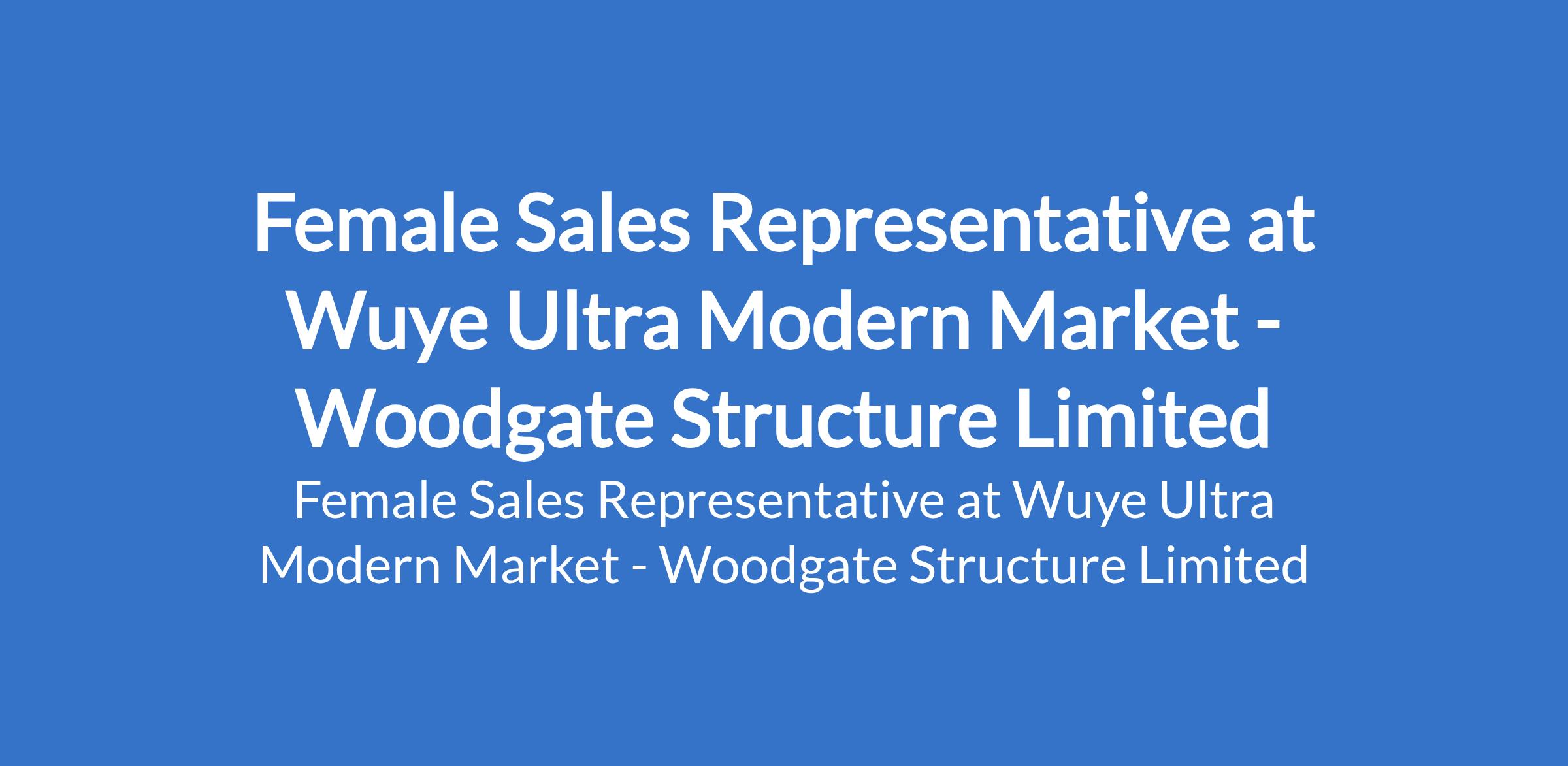 Woodgate Structure Limited - Our client, Wuye Ultra Modern Market is recruiting to fill the position of: Female Sales Representative. The position is located in Wuye, Abuja (FCT). Salary: N80,000 monthly. Interested candidates should possess relevant qualifications.