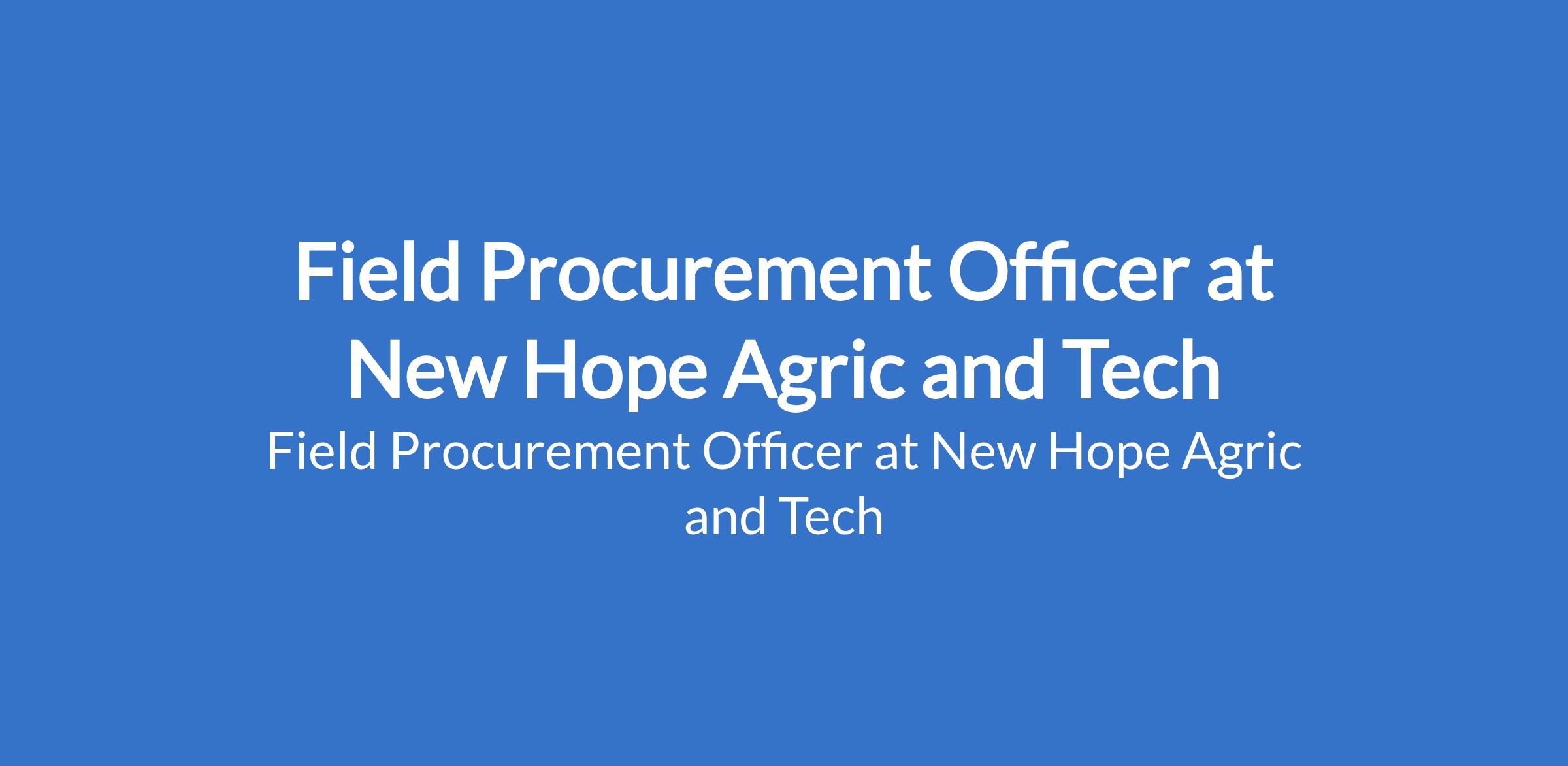 New Hope Agric and Tech is recruiting to fill the position of: Field Procurement Officer. The position is located in Logbara, Along Abeokuta express way, Ogun State. Salary: N120,000 - N150,000 / Month. Interested candidates should possess relevant qualifications with experience.