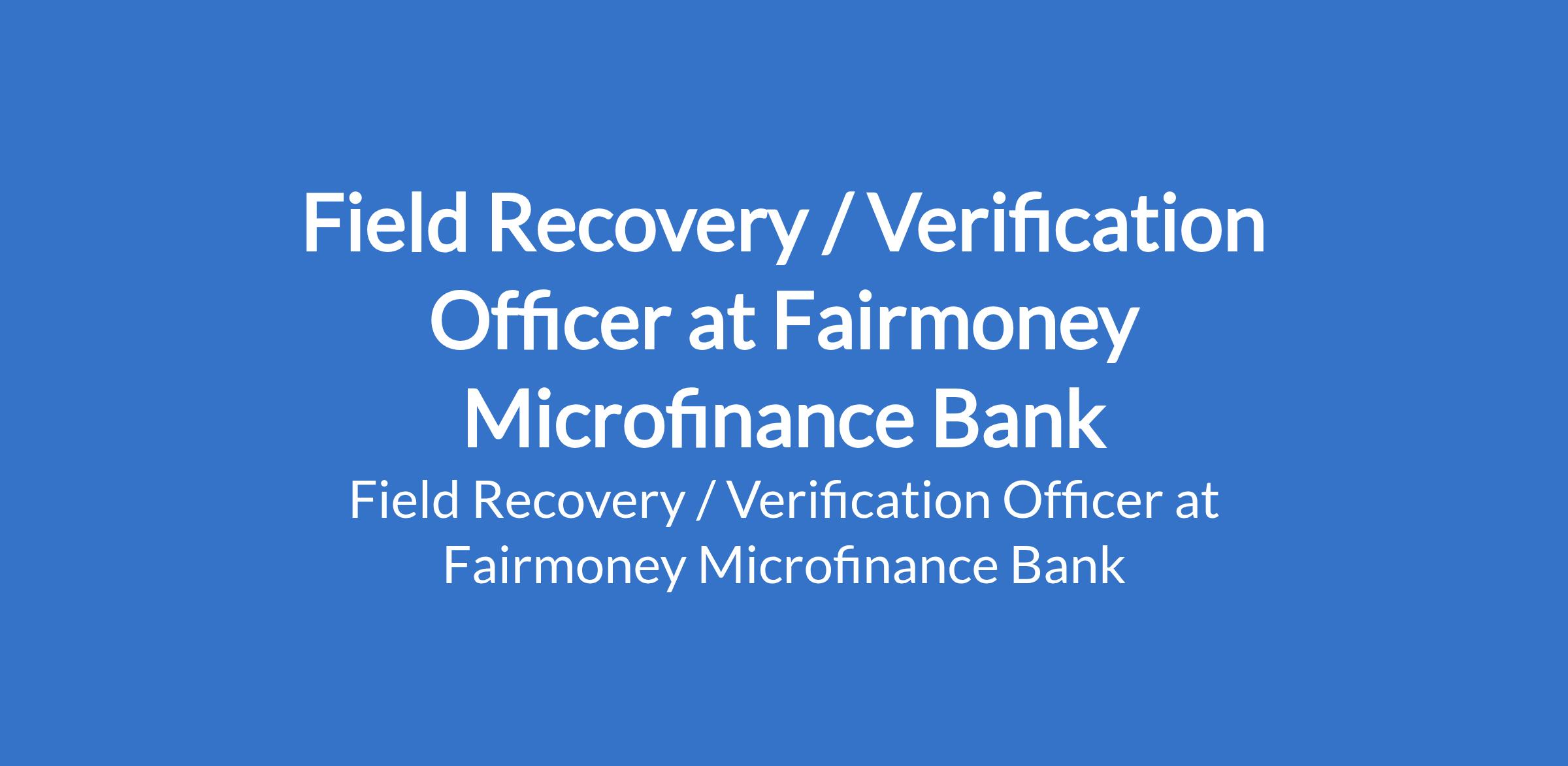 Fairmoney Microfinance Bank is recruiting to fill the position of: Field Recovery / Verification Officer. The position is located in Delta / Edo State. Interested candidates should possess a University Degree in any related field with 1+ years of experience in consumer loans operations and merchants, directly handling delinquent clients and resolving problem situations.