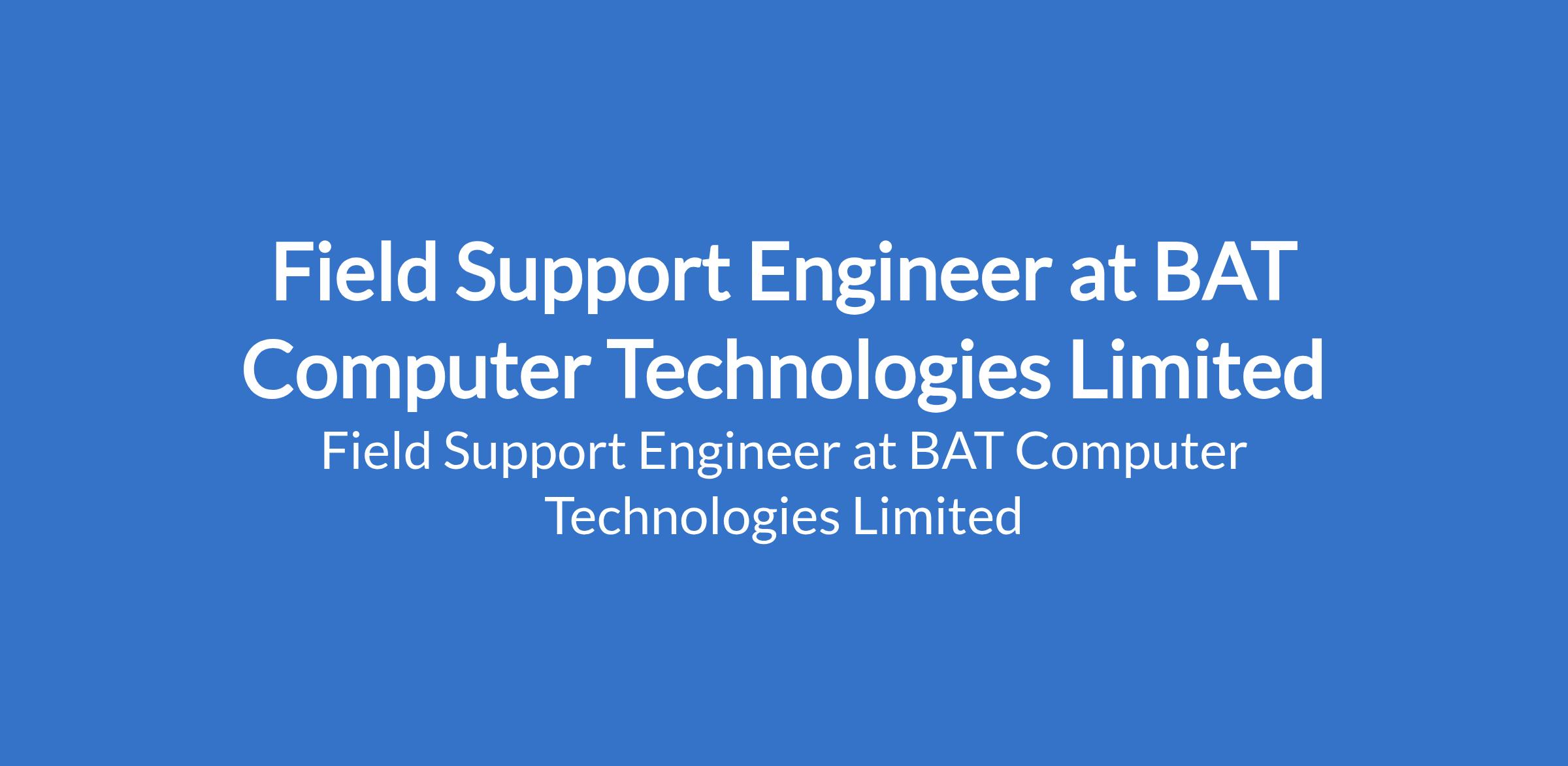 BAT Computer Technologies Limited is recruiting to fill the position of: Field Support Engineer. The position is located in Oshodi, Lagos State. Interested candidates should possess a First Degree in Computer Engineering or any related discipline with 3 - 5 years experience in the Telecommunication Sector and must reside in Oshodi or its axis.