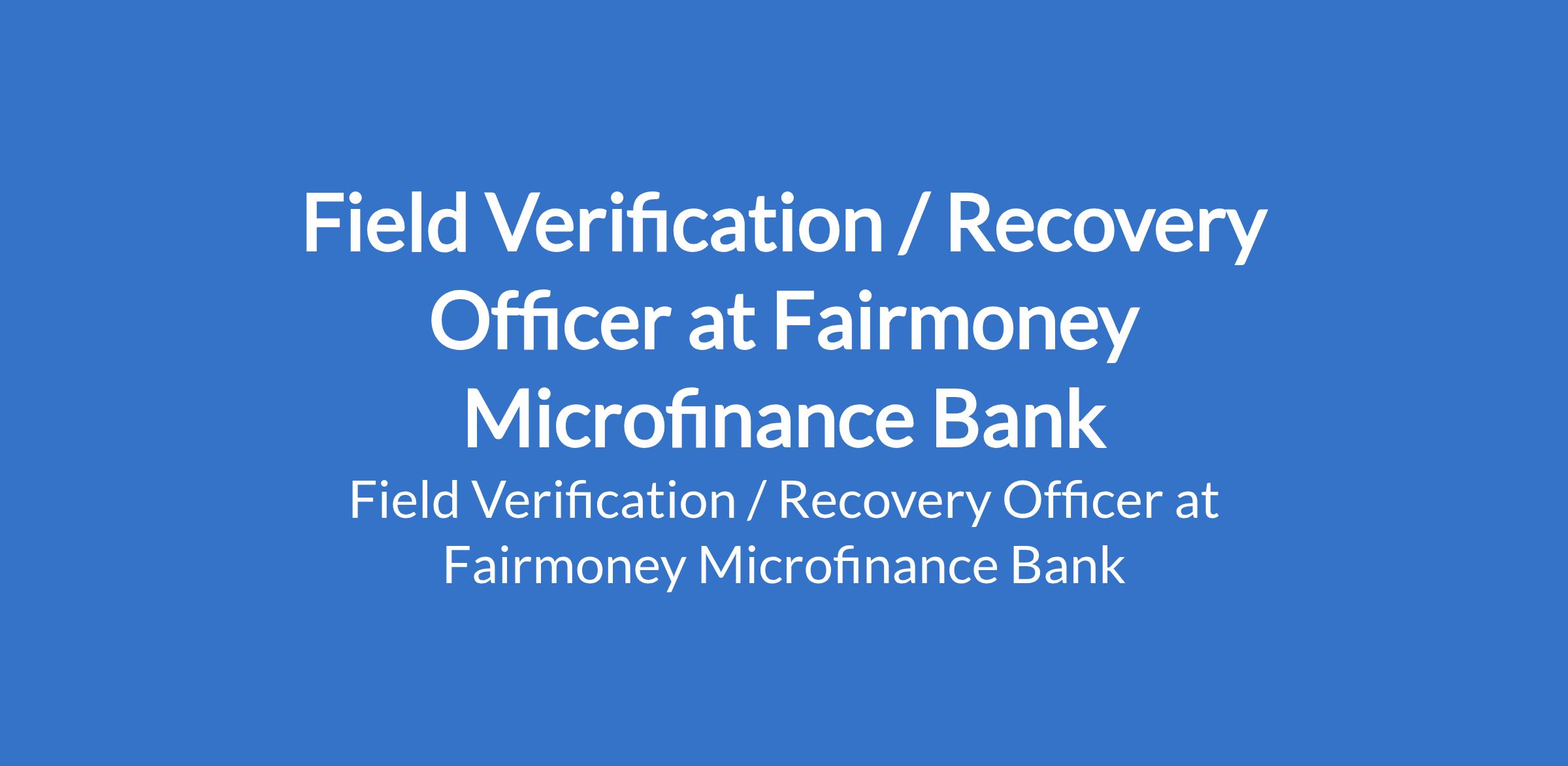 Fairmoney Microfinance Bank is recruiting to fill the position of: Field Verification / Recovery Officer. The position is located in Cross River State. Interested candidates should possess a University Degree in any related field with 1+ years of experience in consumer loans operations and merchants, directly handling delinquent clients and resolving problem situations.