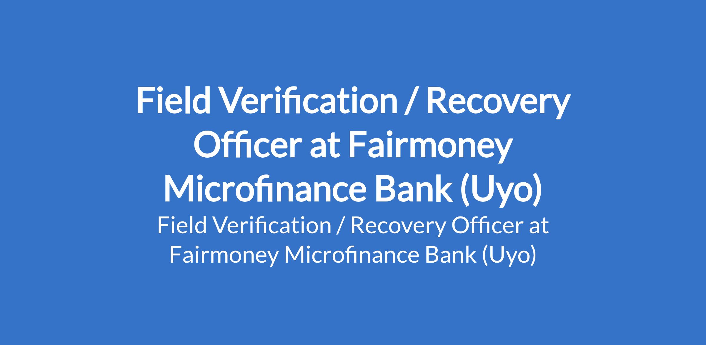 Fairmoney Microfinance Bank is recruiting to fill the position of: Field Verification / Recovery Officer. The position is located in Uyo, Akwa Ibom State. Interested candidates should possess a University Degree in any related field with 1+ years of experience in consumer loans operations and merchants, directly handling delinquent clients and resolving problem situations.
