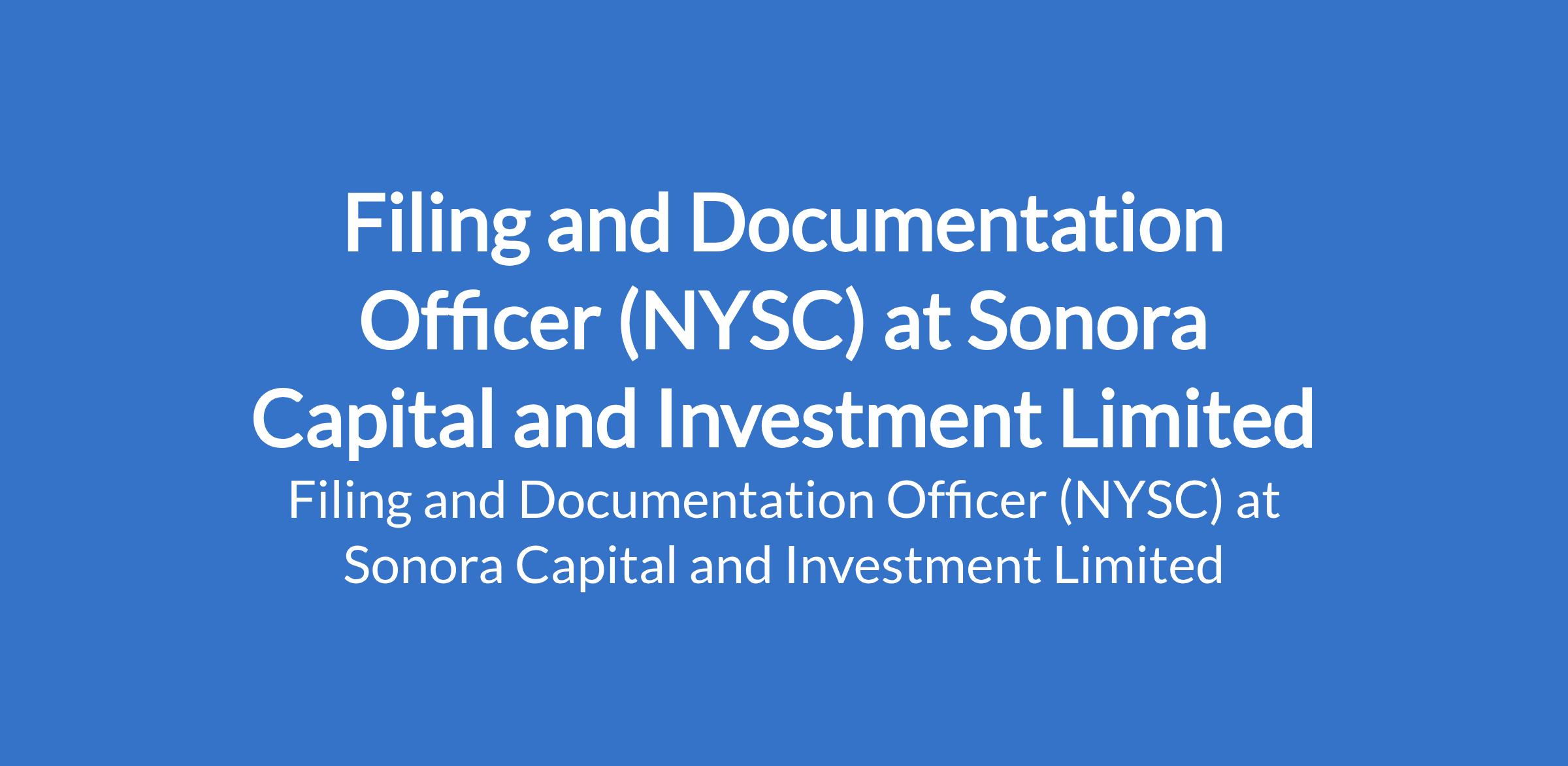 Sonora Capital and Investment Limited is recruiting to fill the position of: Filing and Documentation Officer. The position is located in Ikoyi, Lagos State. Salary: N70,000 - N250,000 per month. Interested candidates should be a corp member awaiting PPA placement with strong organizational and documentation skills.
