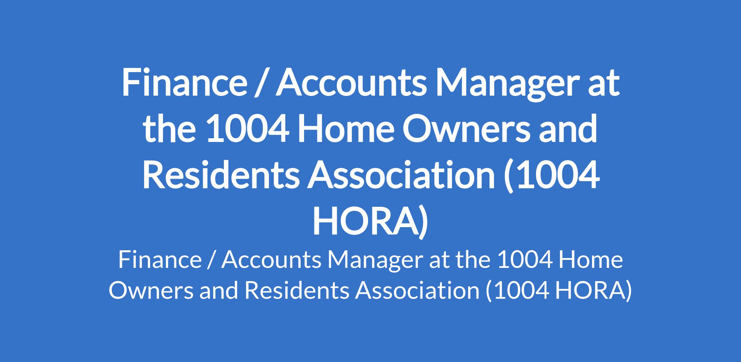 The 1004 Home Owners and Residents Association (1004 HORA) is recruiting to fill the position of: Finance / Accounts Manager. The position is located in Victoria Island, Lagos State. Interested candidates should possess a University Degree in Accounting, Finance or related field with a mnmum of 6 years working experience within the finance/audit and control department of a corporate organisation or professional services organisation
