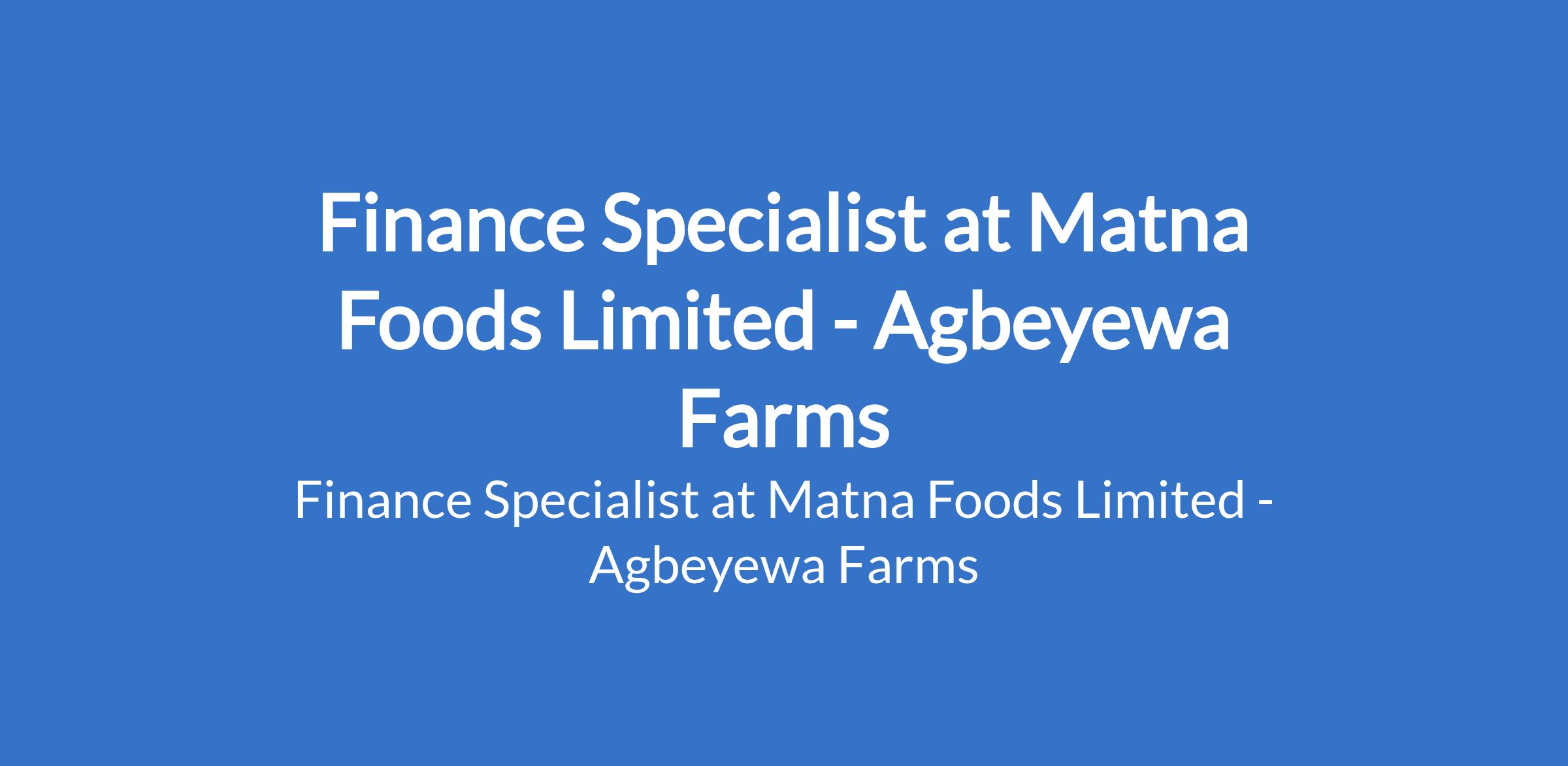 Agbeyewa Farms - Our client, Matna Foods Limited is recruiting to fill the position of: Finance Specialist. The position is located in Akure, Ondo State. Interested candidates should possess a Bachelors Degree in Accounting, Finance, Economics, or related fields with 3 - 6 years finance or accounting experience within FMCG, food processing, agro-processing, or industrial manufacturing.