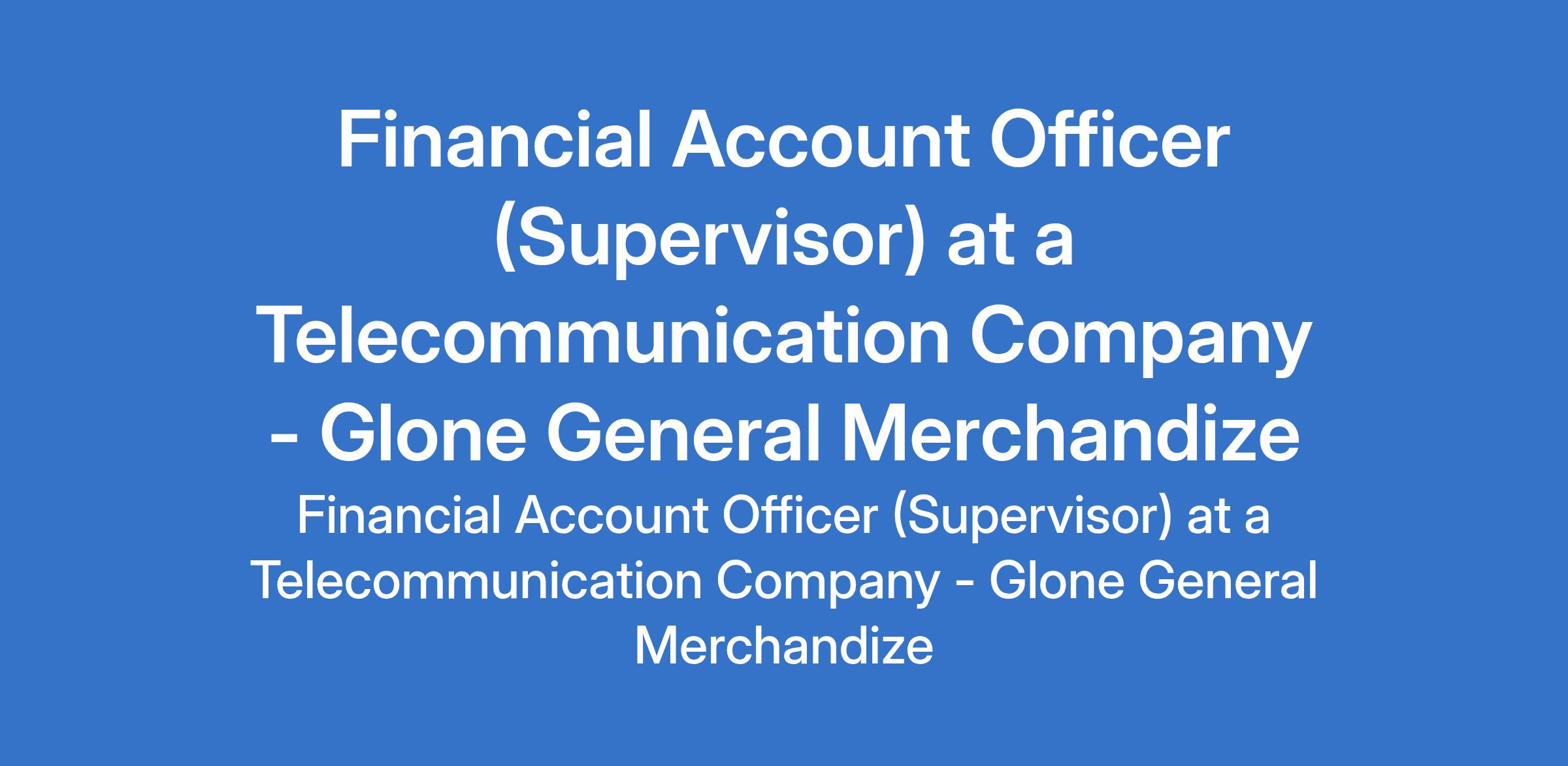 Glone General Merchandize - Our client, a Telecommunication Company is recruiting to fill the position of: Financial Account Officer (Supervisor). The position is located in Lagos State. Interested candidates should possess a B.Sc./HND (minimum 2:2 or Upper Credit) in Accounting or related fields, must be Chartered Accountants (ACA/ACCA) with a minimum of 2 years accounting experience.