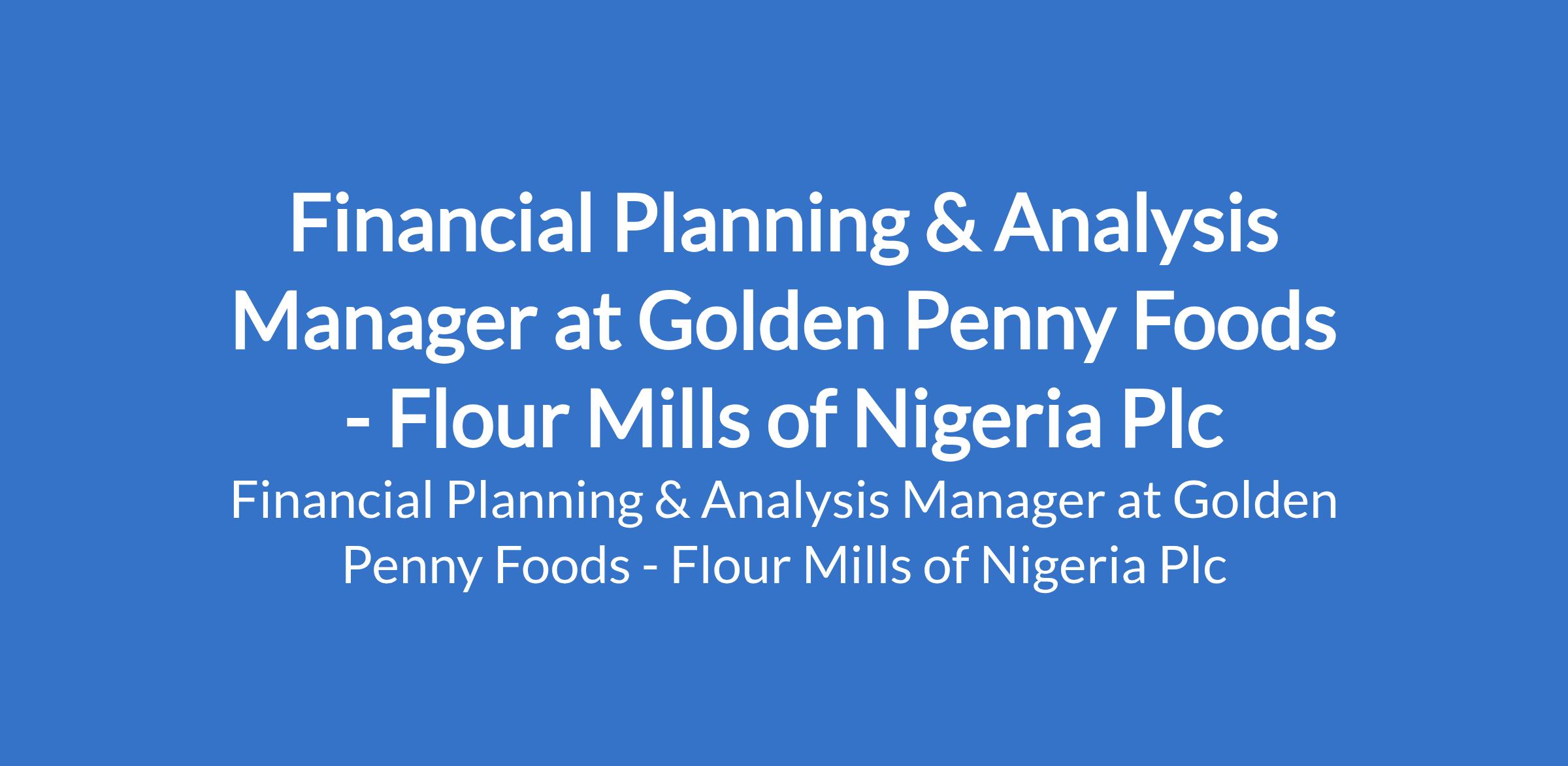 Flour Mills of Nigeria Plc - Our subsidiary, Golden Penny Foods is recruiting to fill the position of: Financial Planning & Analysis Manager. The position is located in Apapa, Lagos State. Interested candidates should possess an HND / Bachelors Degree in accounting, Finance, or related field with 5 years relevant experience in FP&A, finance, or consulting.