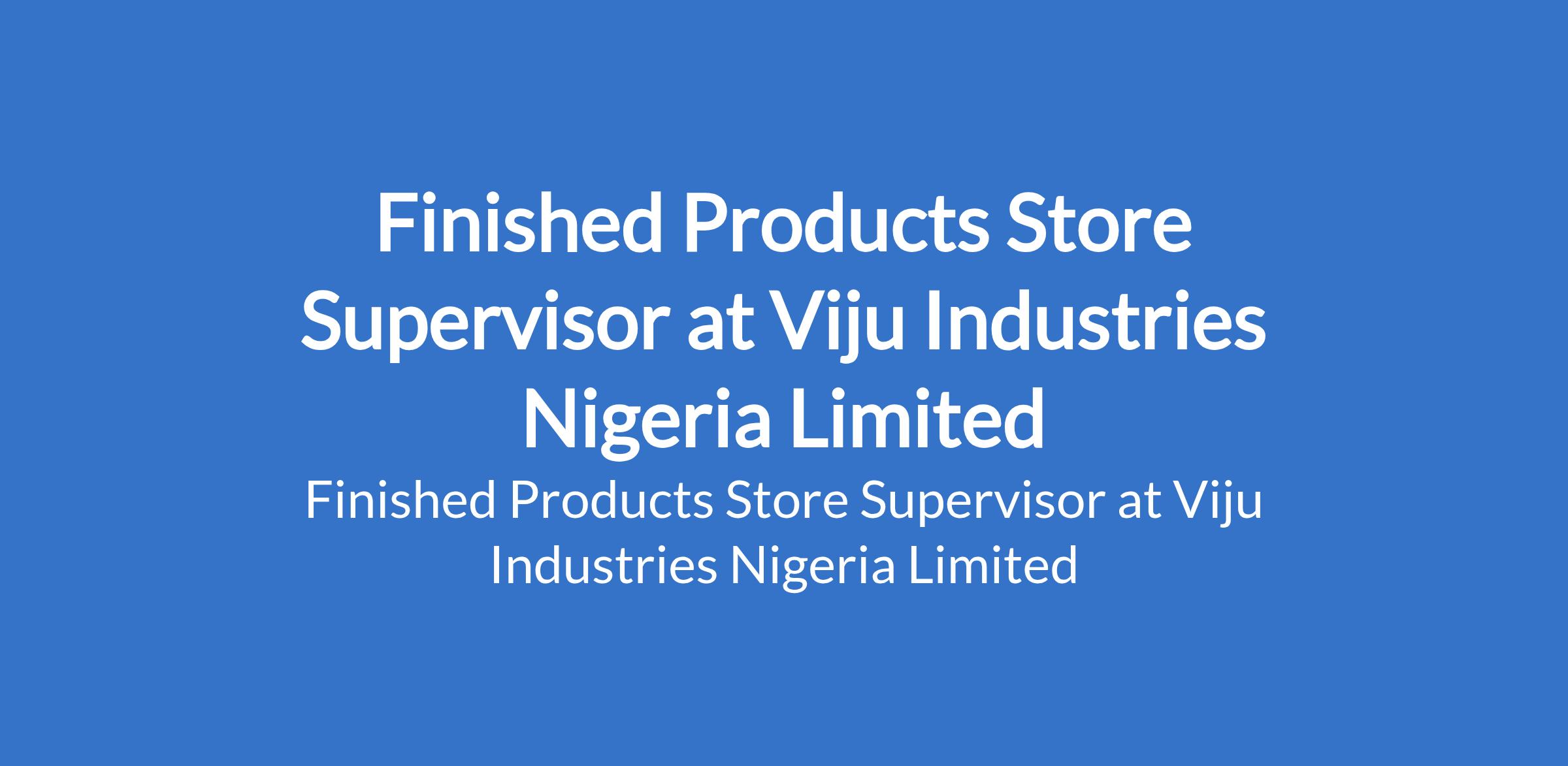 Viju Industries Nigeria Limited is recruiting to fill the position of: Finished Products Store Supervisor. The position is located in Kwali, Abuja (FCT). Salary: N100,000 - N250,000 monthly. Interested candidates should possess relevant qualifications with 3 - 10 years experience.