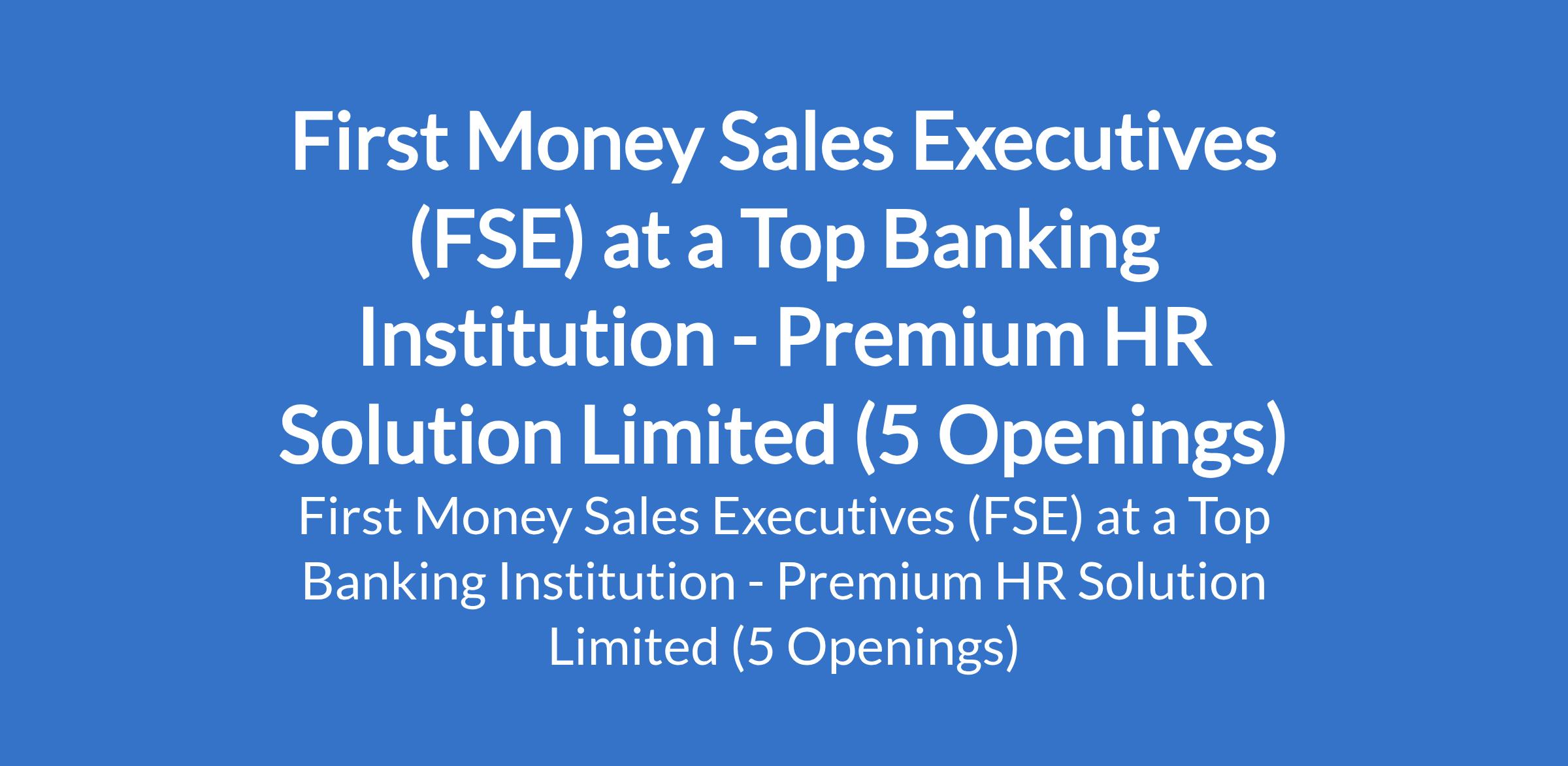 Premium HR Solution Limited - Our client, a top Banking institution is recruiting to fill the position of: First Money Sales Executive (FSE). The position is located in Abuja, Kano, Katsina, Nasarawa, and Kogi States. Salary: N215,000 monthly. Interested candidates should possess an HND (Minimum of Upper Credits) / B.Sc Degree (Minimum of 2.2) with 2 to 5 years experience.