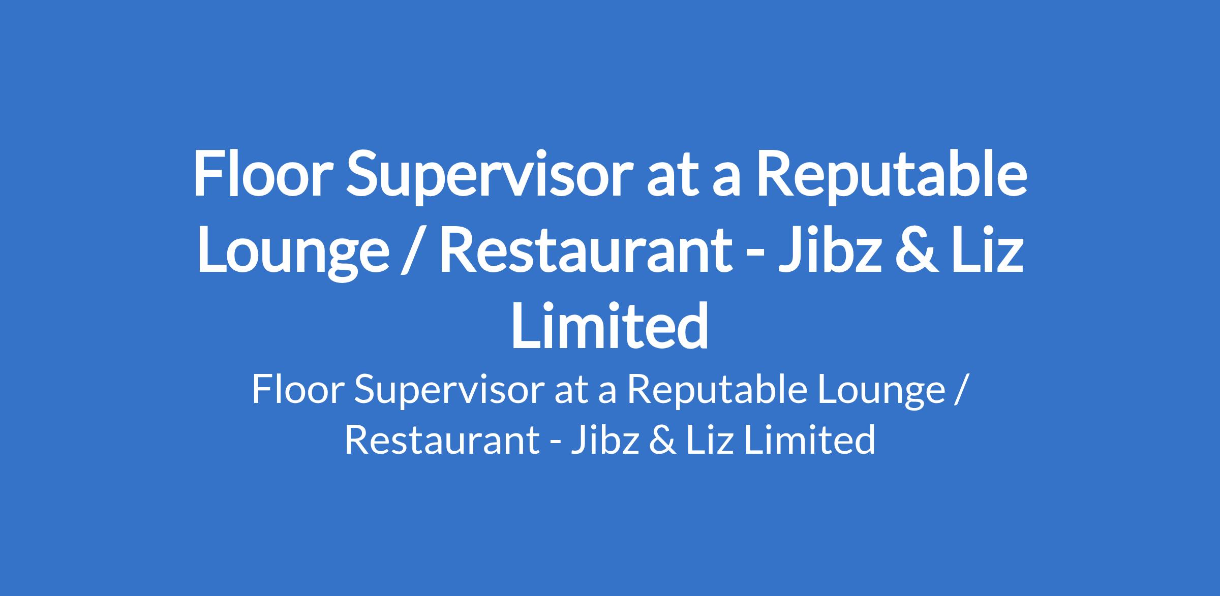 Jibz & Liz Limited - Our client, a reputable Lounge / Restaurant is recruiting to fill the position of: Floor Supervisor. The position is located in Surulere, Lagos State. Salary: N150,000 monthly. Interested candidates should possess an OND / Bachelor's Degree with 1-10 years experience.