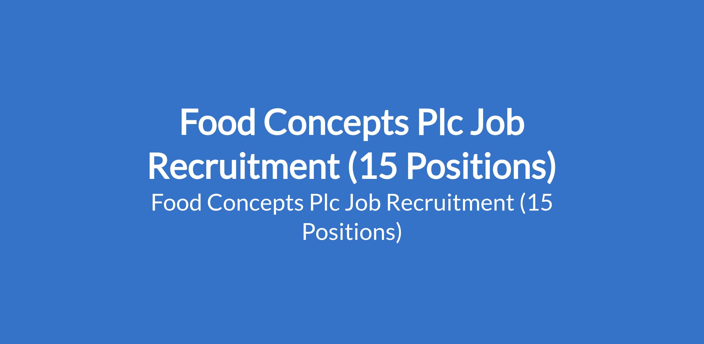 Food Concepts Plc is recruiting to fill the following positions in Abuja, Rivers, Kwara, Akwa Ibom and Lagos State: Shift Officer, Central Kitchen; Maintenance Officer; Production Support Officer; Supervisor - Pie Production Unit; Shift Officer - Central Kitchen; Cook Support / Production Support Officer - Central Kitchen / PPU; Baker / Molder; Warehouse Operatives (Loader / Motorboy / Truck Driver); Project Associate, Transport Officer, Warehouse / Logistics Manager, Learning & Development (L&D) Admin Officer, and Learning & Development (L&D) Admin Manager.