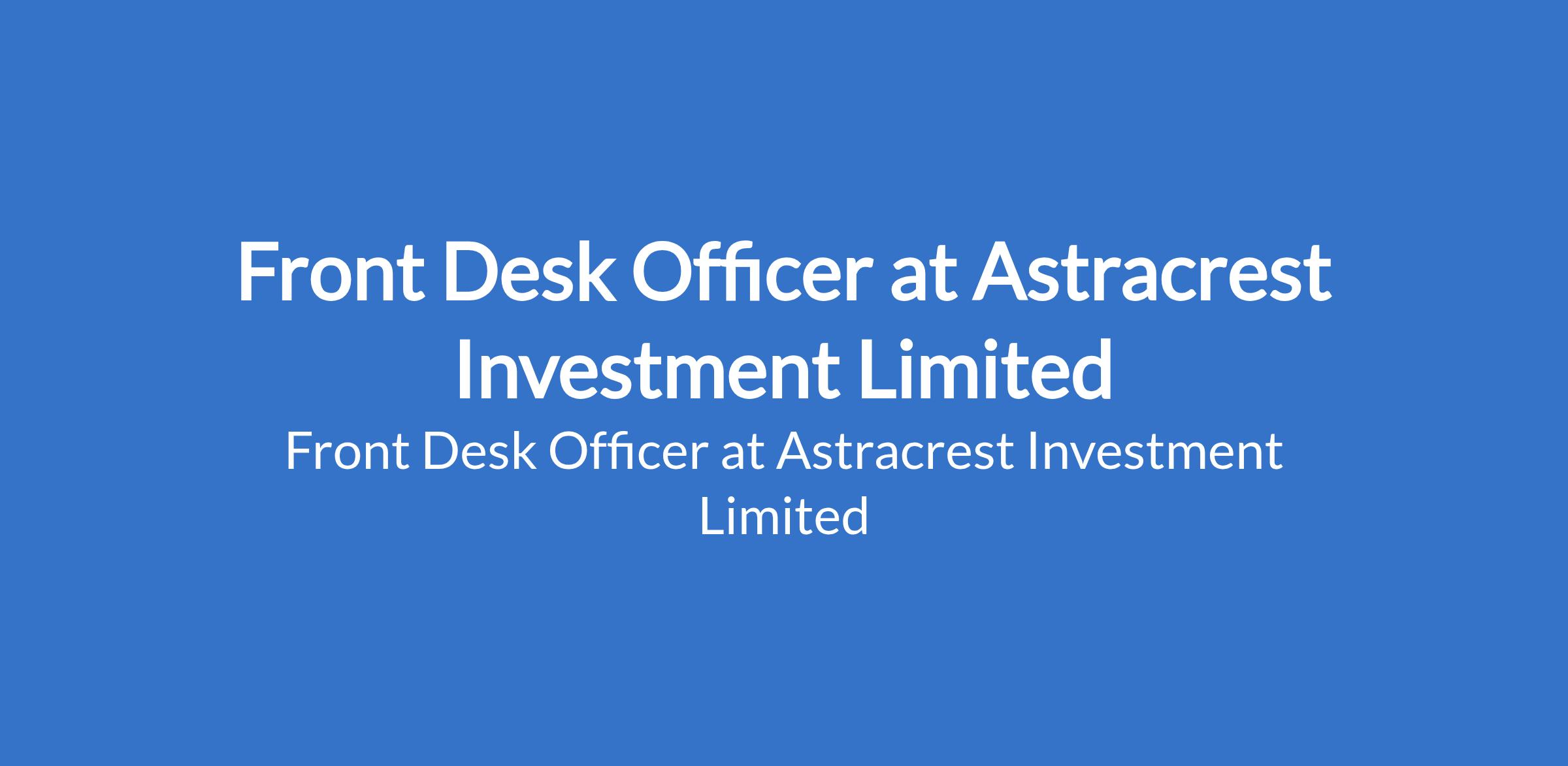 Astracrest Investment Limited is recruiting to fill the position of: Front Desk Officer. The position is located in Lagos State. Salary: N100,000 - N130,000 per month. Interested candidates should possess a minimum of an OND / HND / Bachelors Degree in Business Administration, Mass Communication, or related field with 12 years of experience in a front desk, receptionist, or customer service role; experience in real estate, hospitality, or corporate office environments is an advantage.