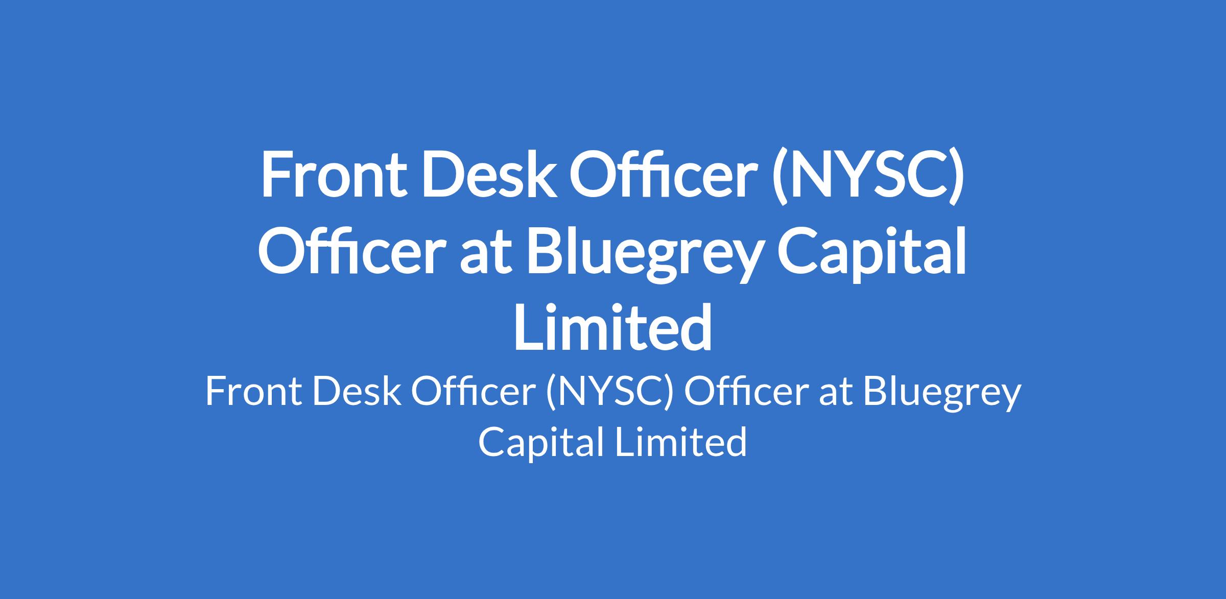 Bluegrey Capital Limited is recruiting to fill the position of: Front Desk Officer (NYSC). The position is located in Abuja (FCT). Salary: N90,000 - N105,000 / Month. Interested candidates should possess a Degree in Finance, Business Administration, or related fields.