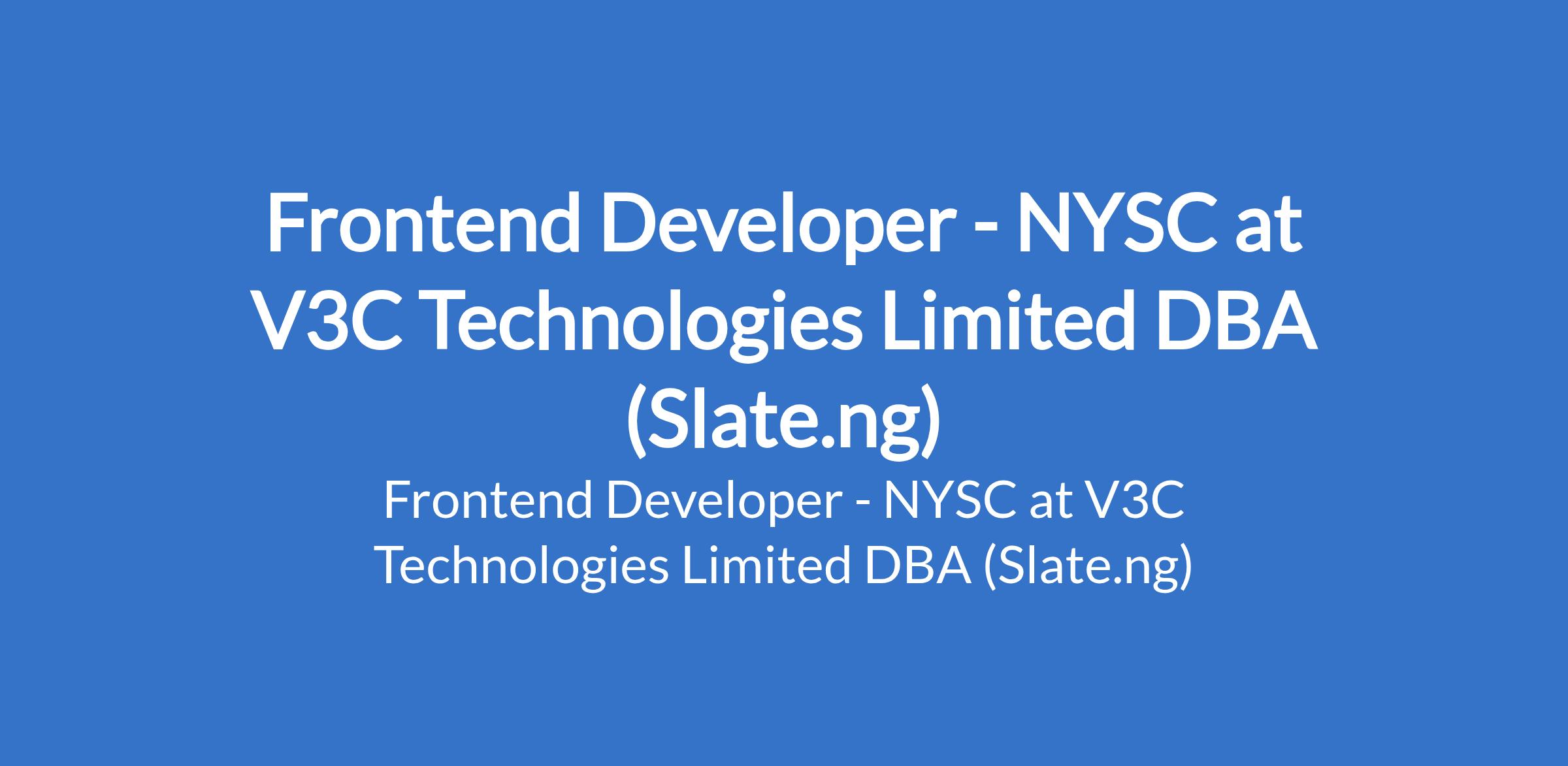 V3C Technologies Limited DBA (Slate.ng) is recruiting to fill the position of: Frontend Developer - NYSC. The position is located in Gwarimpa, Abuja (FCT). Salary: N100,000 / month. Interested candidates should possess a Bachelor's Degree in Computer Science, Information Technology, or a related field (or equivalent experience) with relevant work experience.