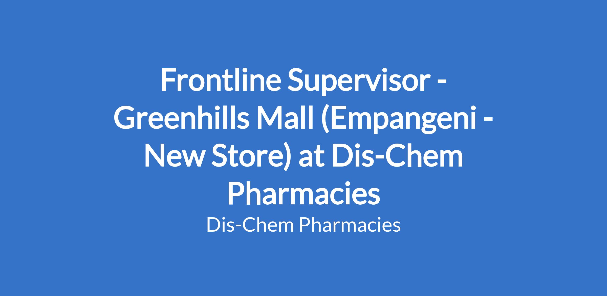 Dis-Chem Pharmacies require a Frontline Supervisor for their Greenhills Mall (Empangeni - New Store). Support customer service to ensure a world class shopping experience.