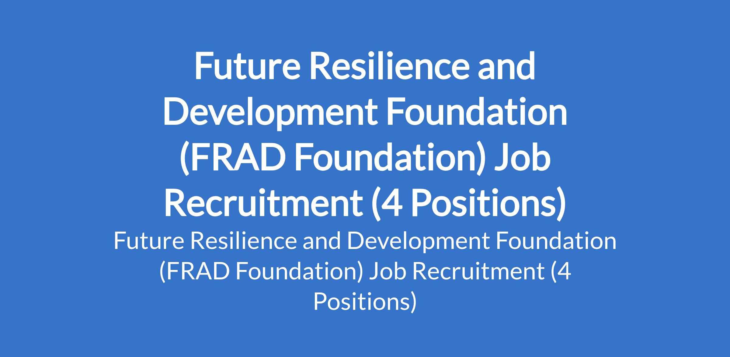 Future Resilience and Development Foundation (FRAD Foundation) is recruiting suitable candidates to fill the following positions in Borno State: Advocacy and Capacity Building Officer, Consultant (Periodic Market & Value Chain Assessments), Consultant (Routine Verterinary Services), and Consultant (Capacity Building of Dairy Farmers).