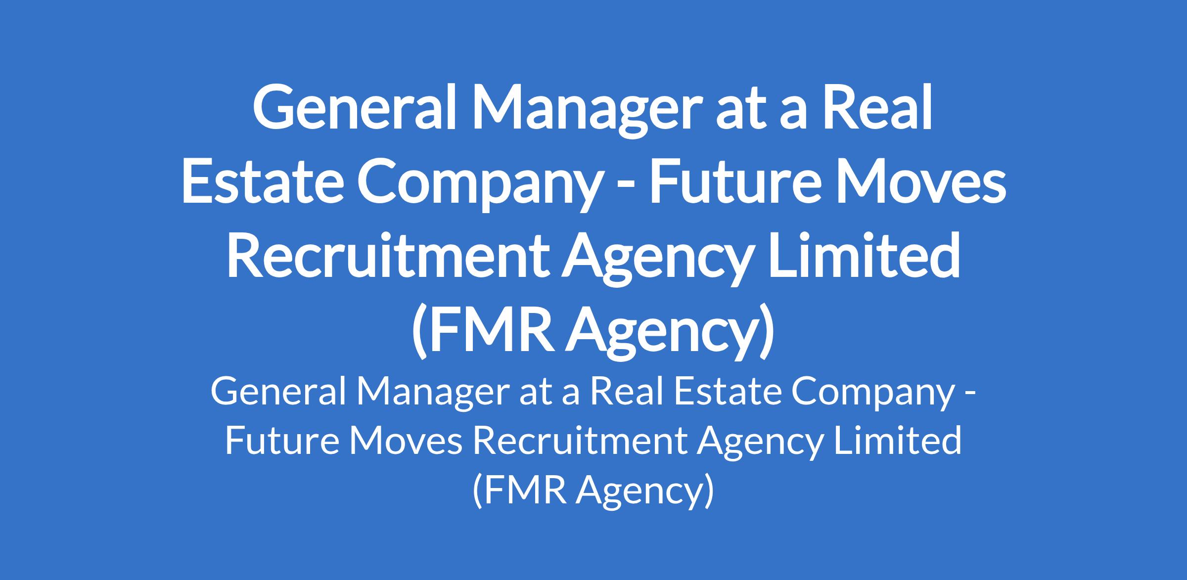 Future Moves Recruitment Agency Limited (FMR Agency) - Our client, a Real Estate company is recruiting to fill the position of: General Manager. The position is located in Abuja (FCT). Interested candidates should possess a Bachelor's Degree with 7 10 years senior management experience across diversified businesses; MBA or postgraduate qualification is an added advantage.