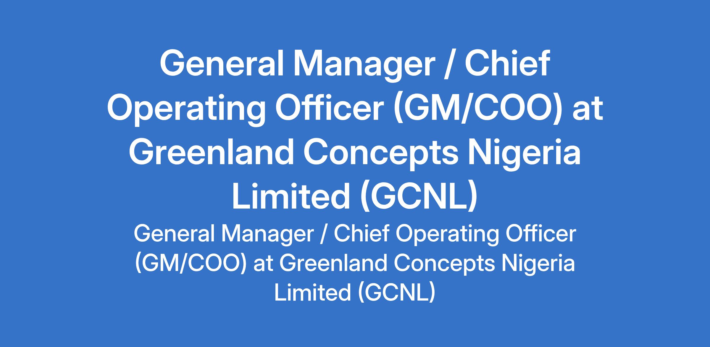 Greenland Concepts Nigeria Limited (GCNL) is recruiting to fill the position of: General Manager / Chief Operating Officer (GM/COO). The position is located in Abuja (FCT). Interested candidates should possess a Bachelors Degree in Business Administration, Management, Engineering, Finance, or related field (MBA or relevant postgraduate degree is an advantage) with 10 15 years relevant experience, with at least 10 years in a senior management role.